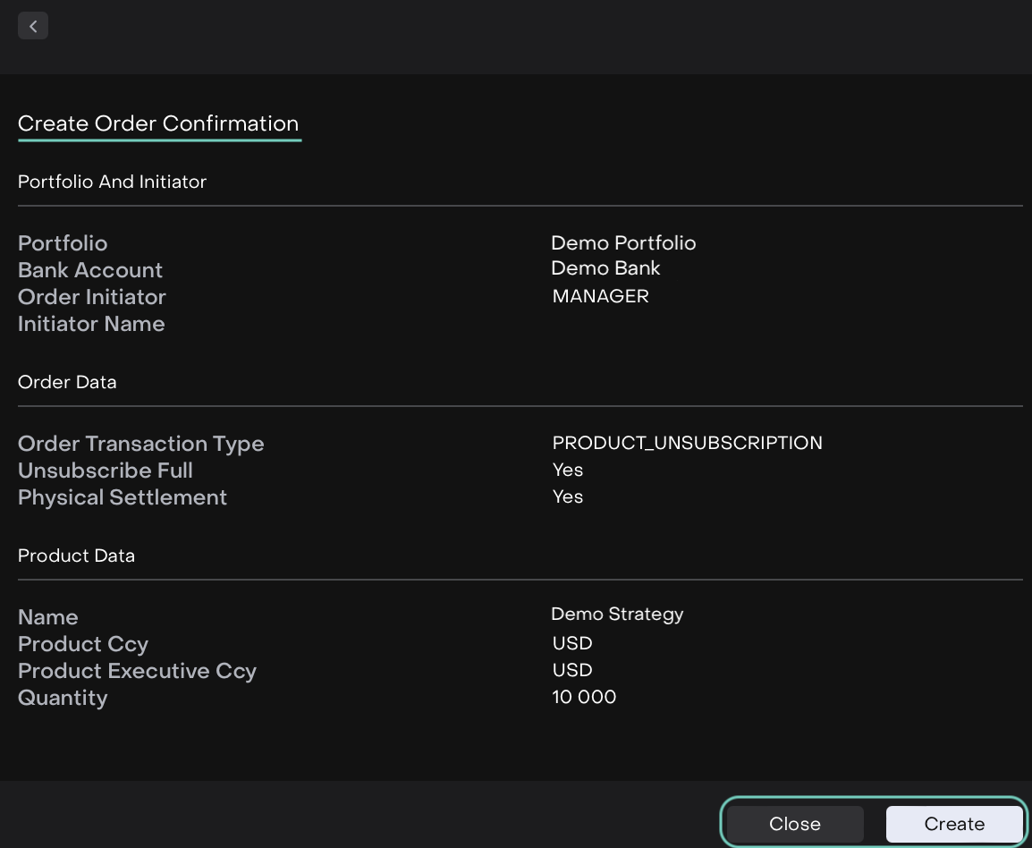 A confirmation page appears. Click Create to finalize the order or Close to return without submitting.