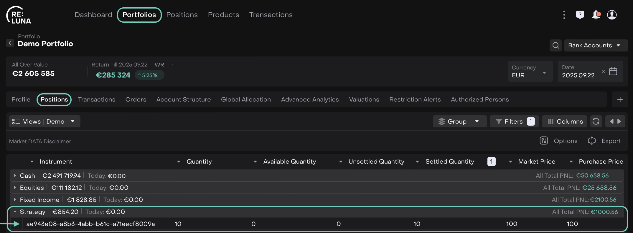 The platform will always display the list of positions for the selected strategy, with an option to expand and view details.