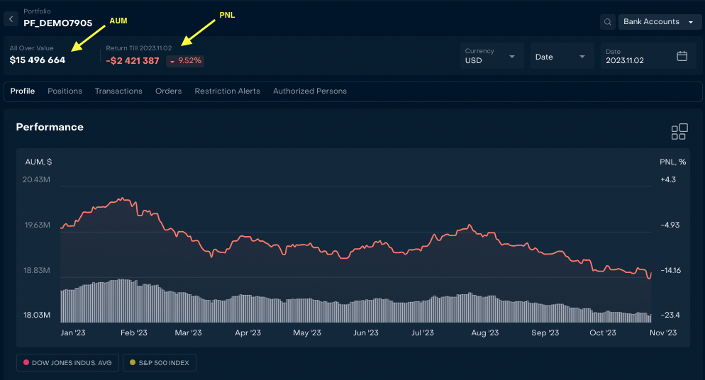 Portfolio Cash, AUM and PNL (daily, realized, unrealized, total etc) are available in USD, EUR, RUB, GBP, CHF on selected date.