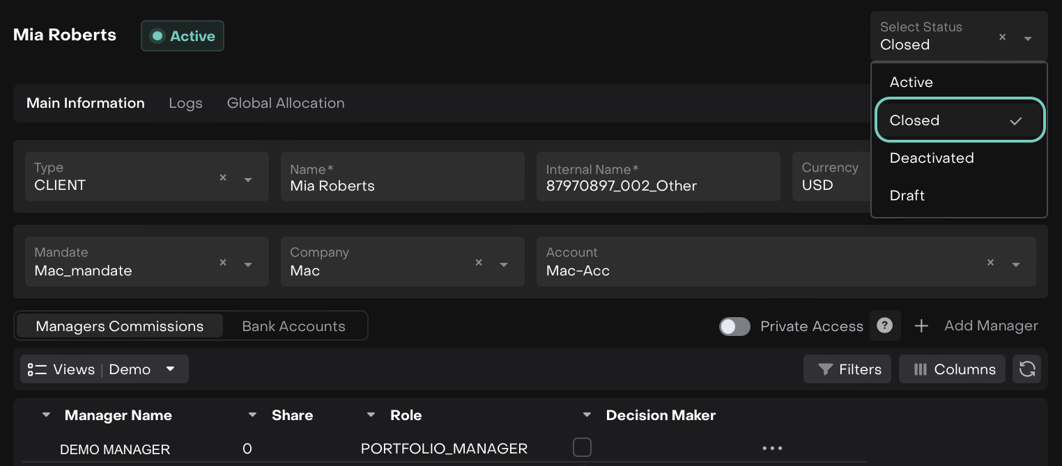 To close Portfolio ensure that all related objects are closed (Bank Account(s), Mandate) and Fees are charged. To close Portfolio open its screen and change the status.