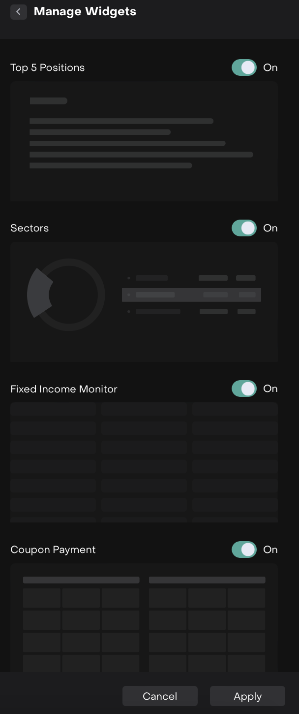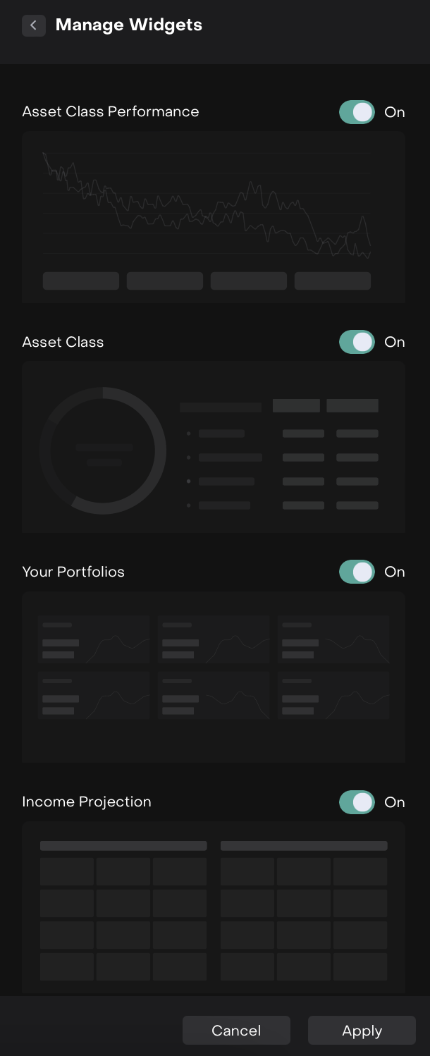 icon to choose which widgets to show or hide. A pop-up will appear where you can easily switch each widget On or Off and Apply/Cancel the changes.