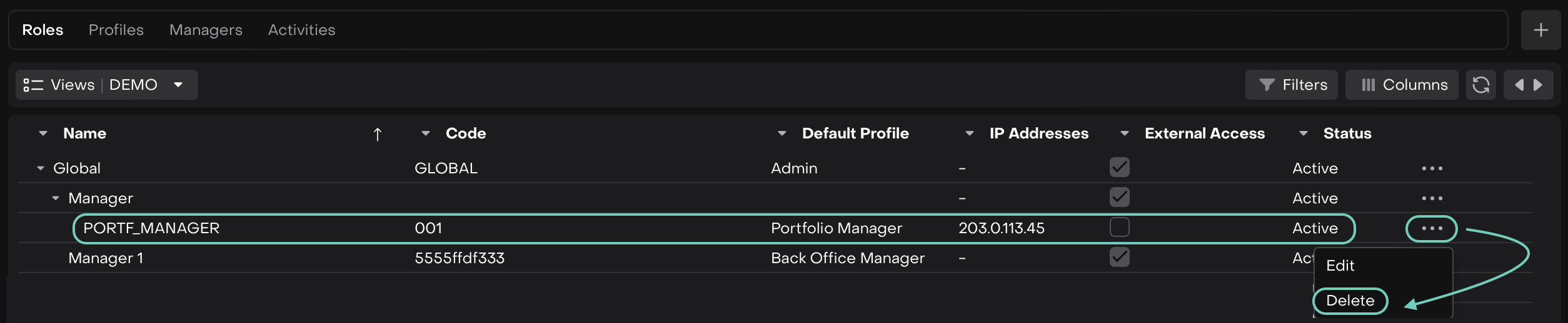 Deleting a role transfers ownership of all records associated with that role to another. Ensure all responsibilities are transferred before deleting.