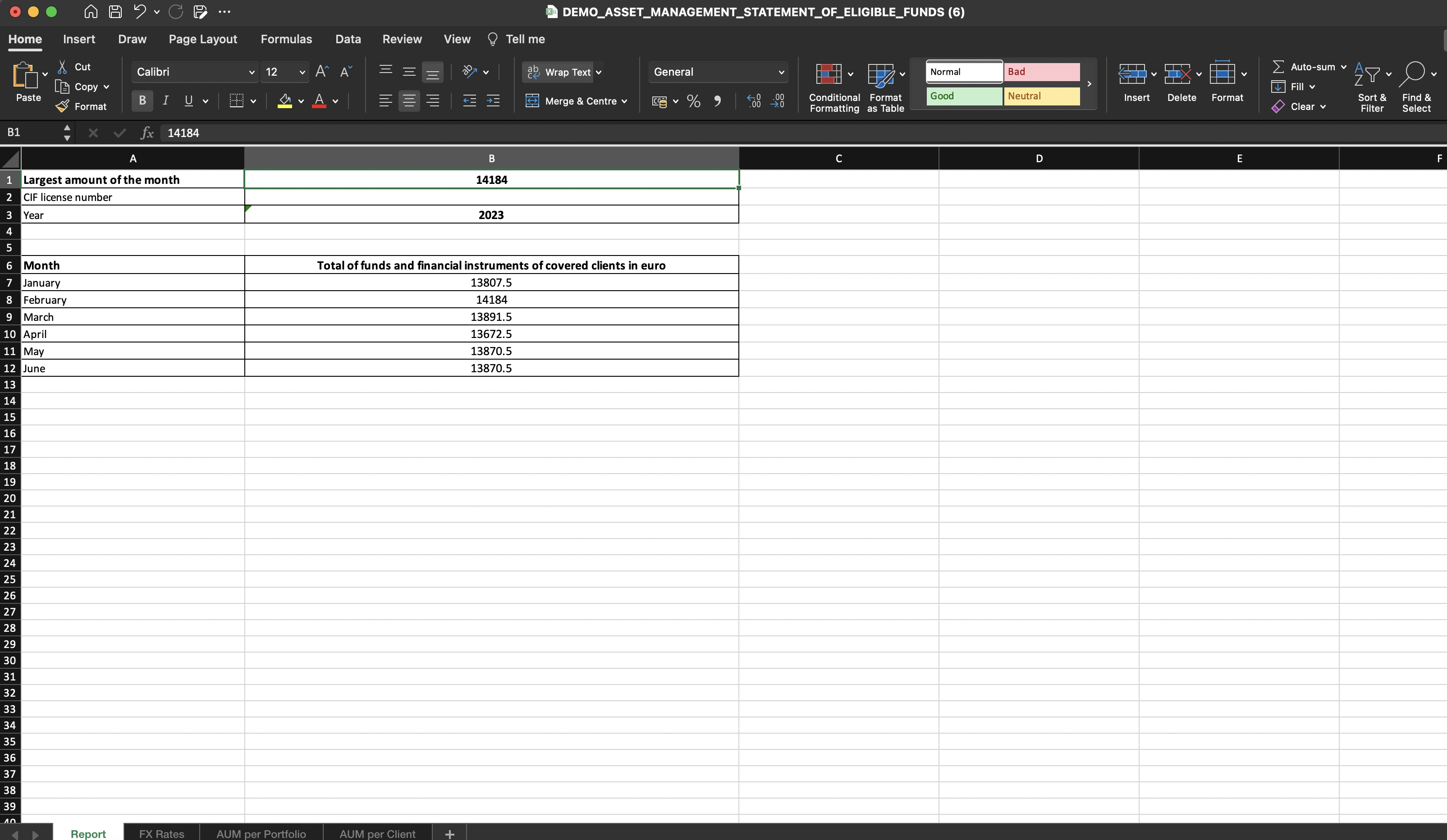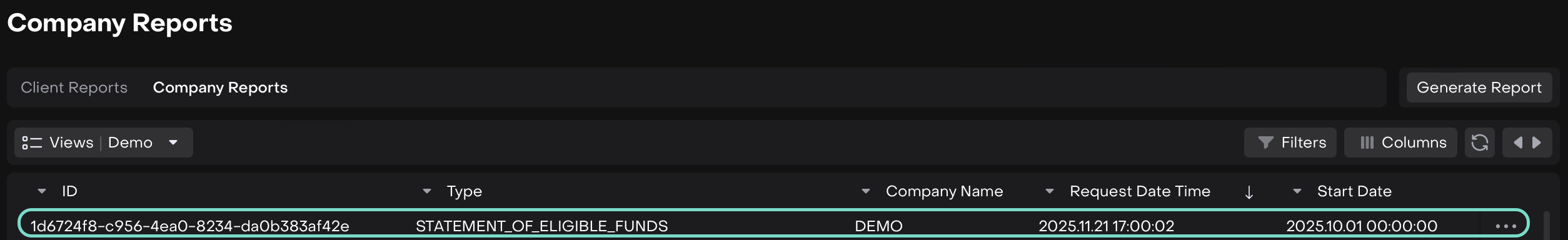 In the platform, you can automatically generate the Statement of Eligible Funds report with just a few clicks. This report summarizes the Assets Under Management (AUM) of all Retail Clients month-by-month for the period you request. It helps you understand eligible monthly AUM totals for regulatory and internal reporting.