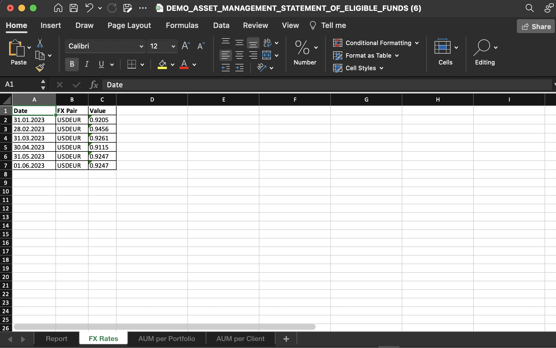 ECB FX Rate | The end-of-month foreign exchange reference rate published by the European Central Bank, used to convert AUM values to EUR. |