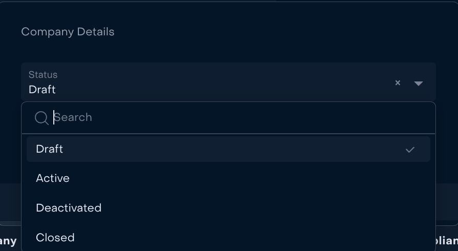 Available status options: Draft, Active, Deactivated or Closed.