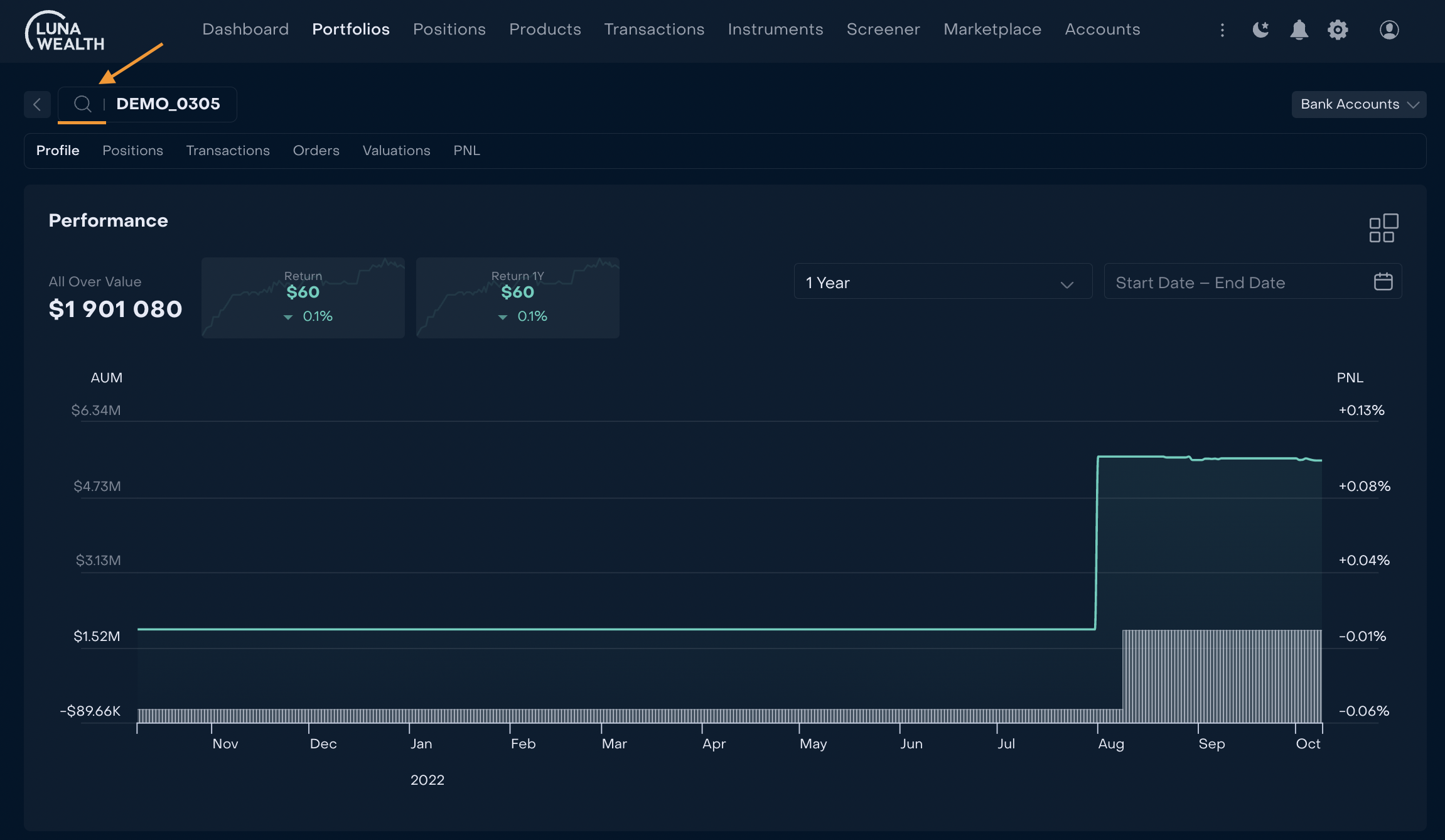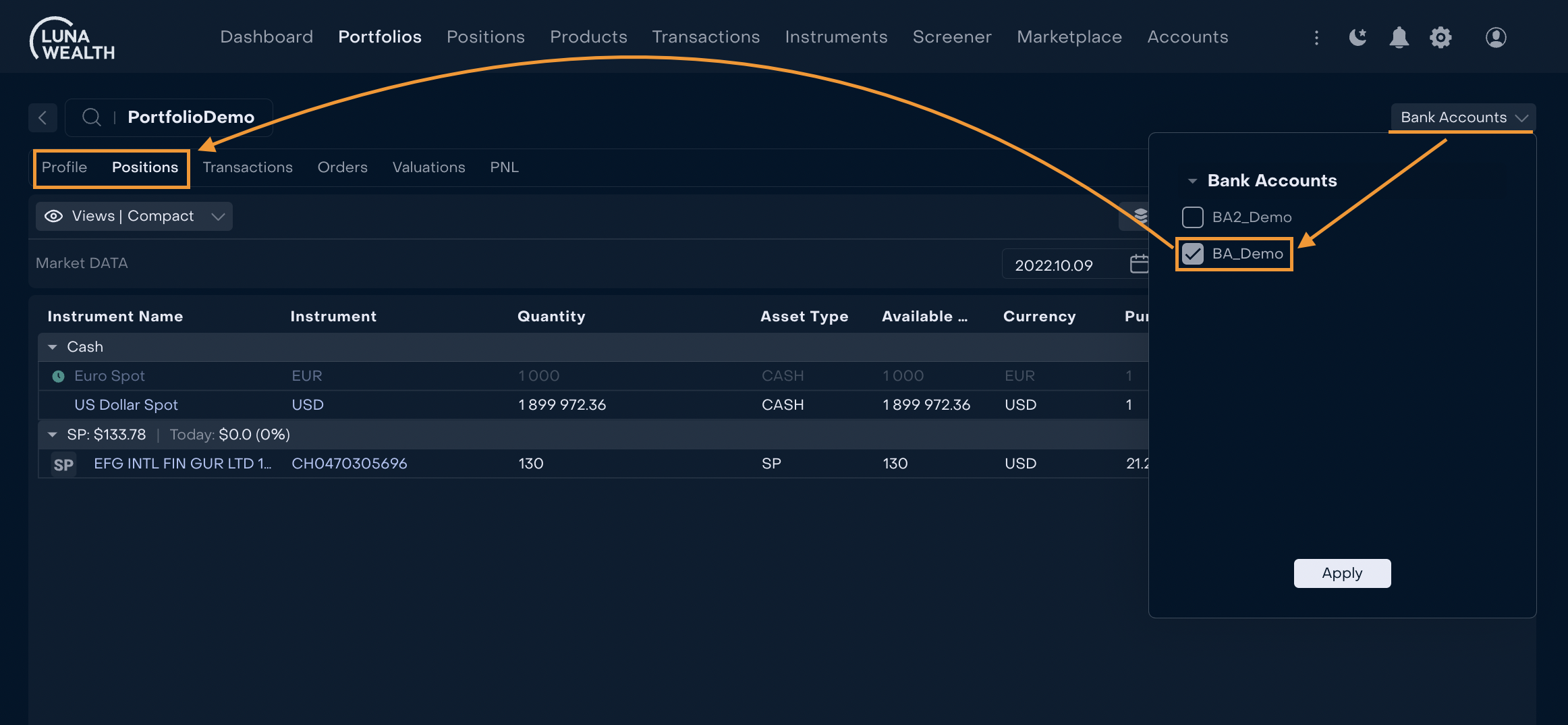 Added a feature that helps to select bank account(s) and display portfolio profile data and positions related to selected bank accounts.