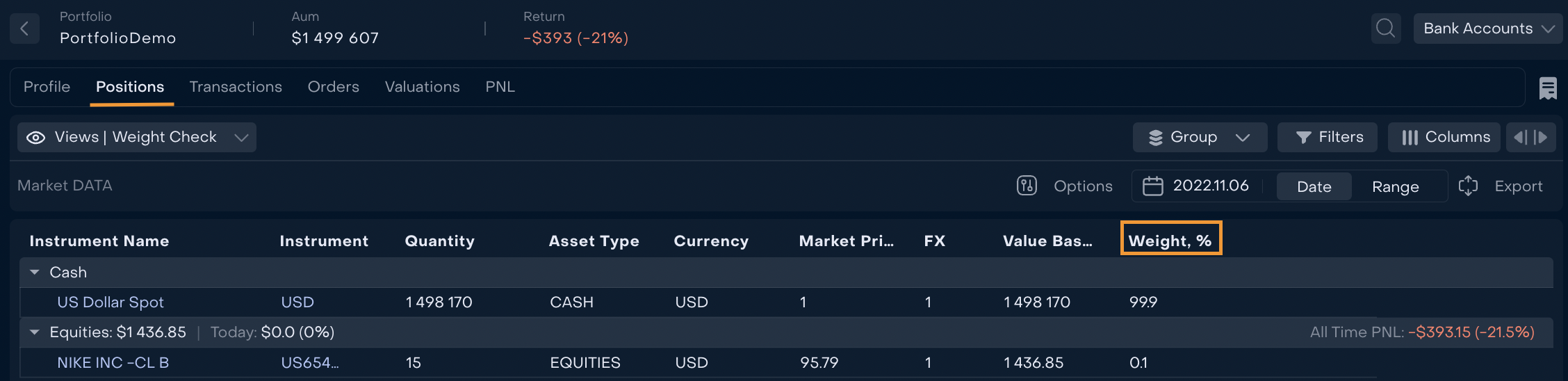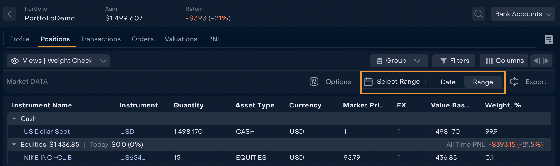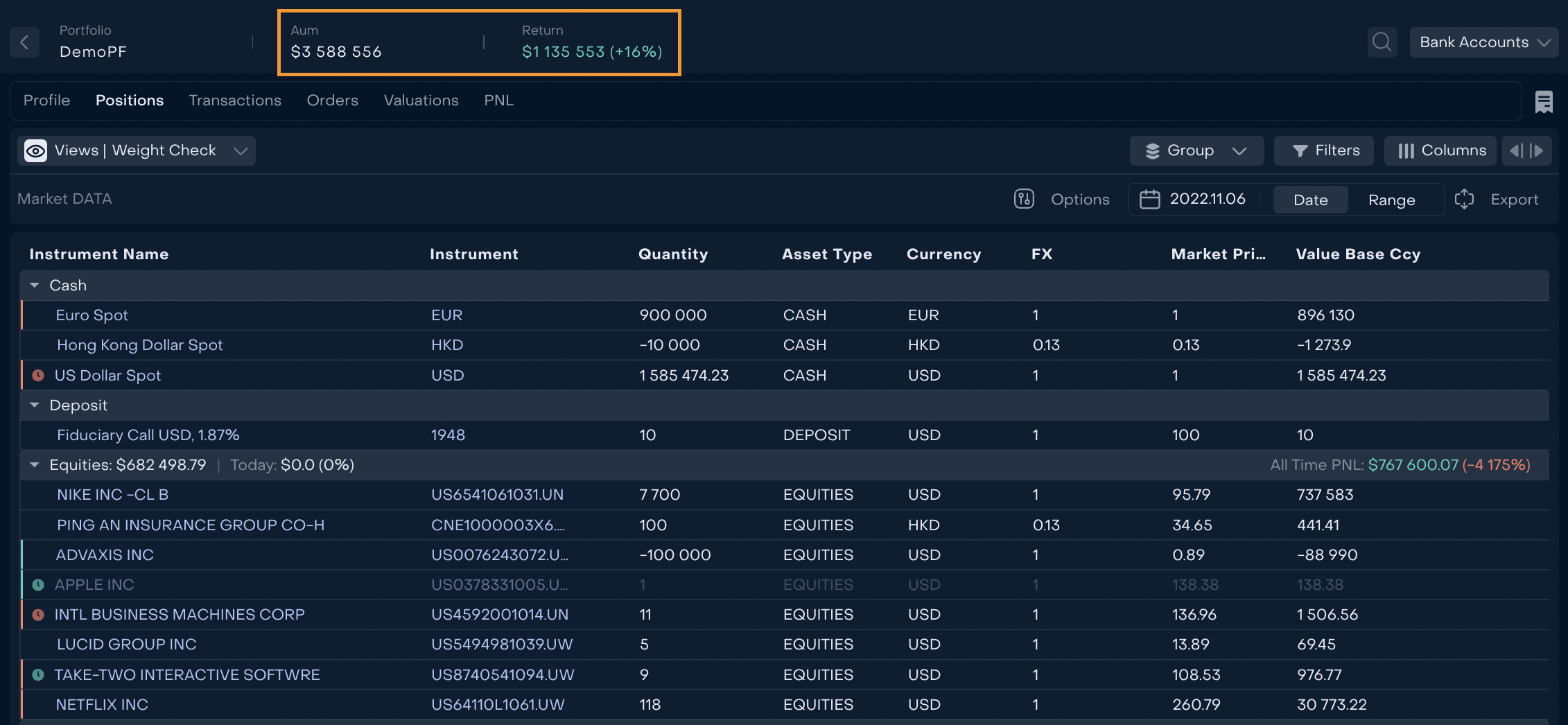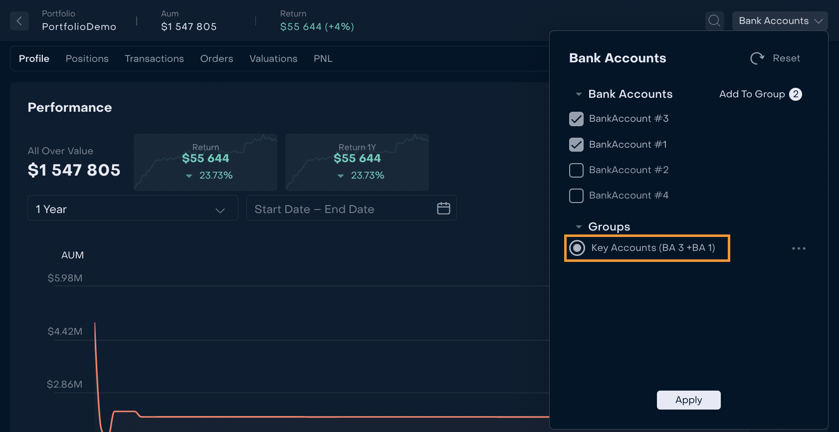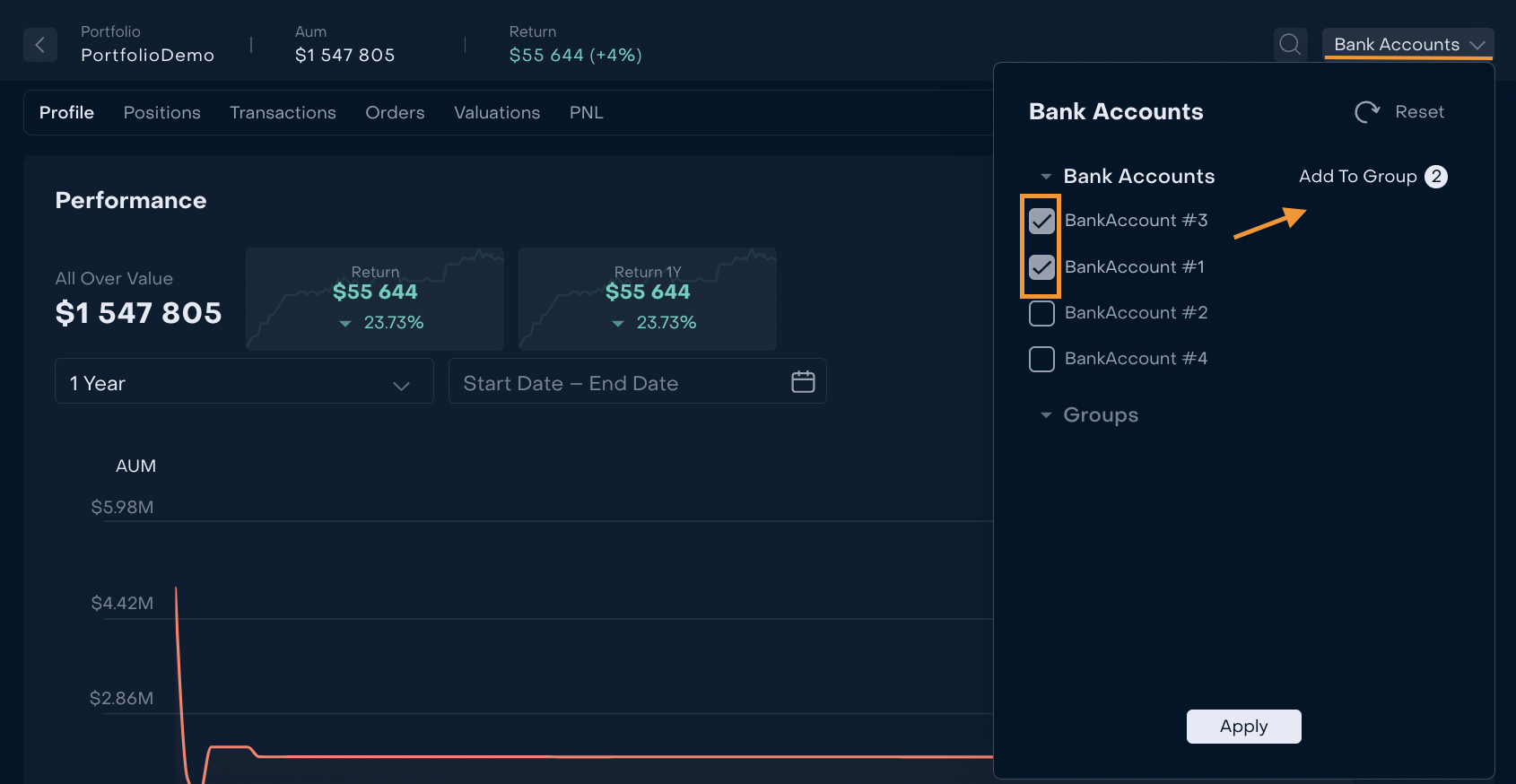 Users can create group(s) of Bank Accounts of a Portfolio. When the group is active, Portfolio’s Profile and Positions are displayed in relation to Bank Accounts from the group.