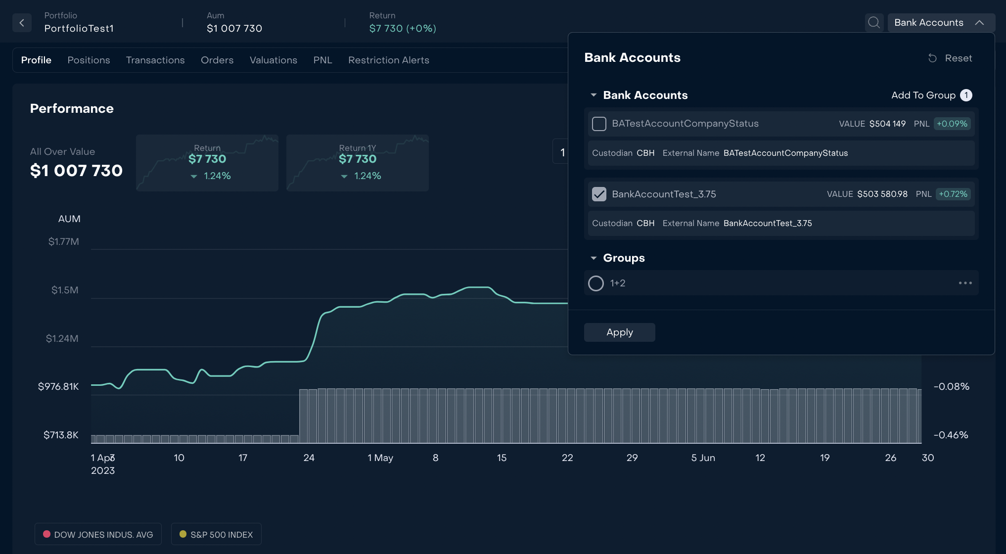 Bank account filter is supplemented by its name, custodian, value and PNL.