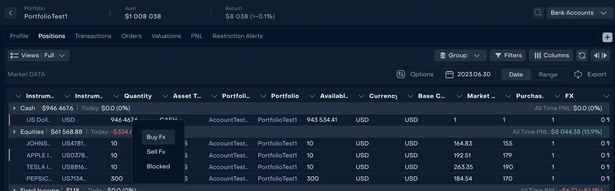 The system uses Date and Currency set by user on positions to display Value and PNL of a bank account.