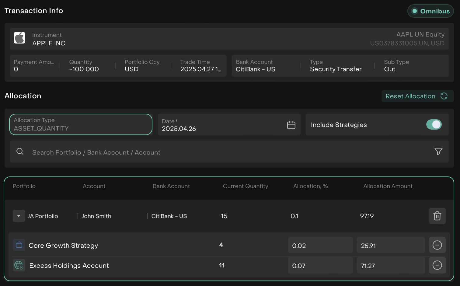 After clicking Allocate, the platform will guide you through allocating transactions using predefined logic â including the option to apply the allocation directly to a strategy