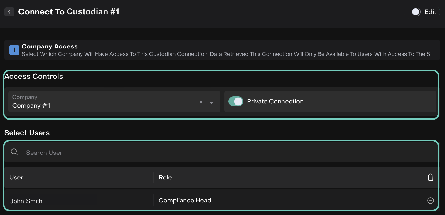 Access Controls: Assign custodian visibility at the company level and toggle âPrivate Connectionâ for restricted access.