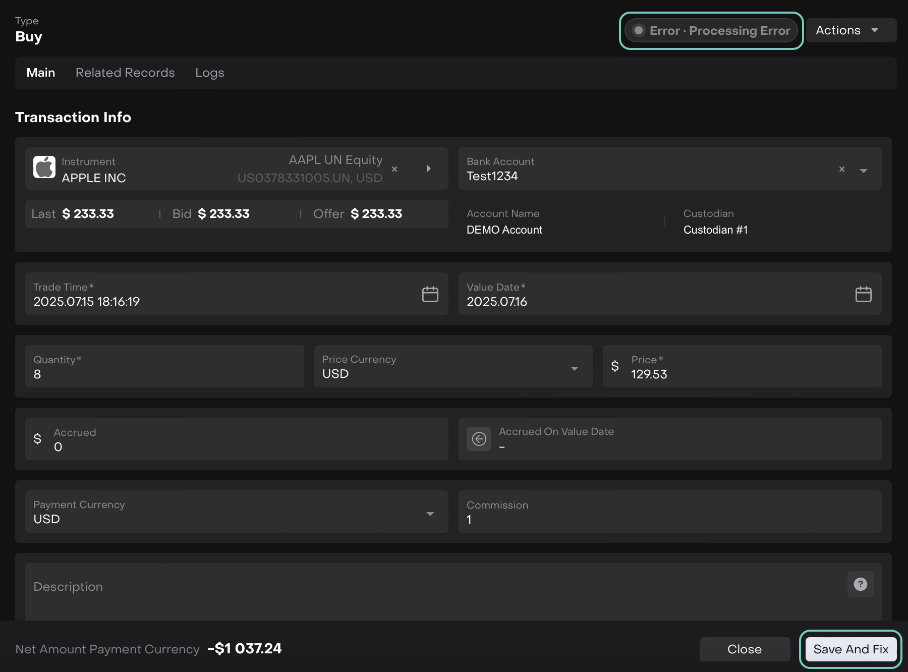Manual Fix: You can manually edit and update missing data using the Save & Fix button. Once saved, the transaction moves to Pending β Not Matched.