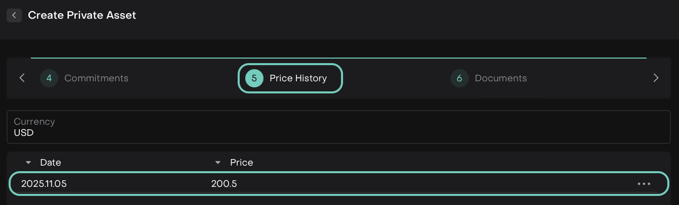 For private instruments (Tangible, Intangible and Private Equity), the Private Asset creation flow now includes a Commitments step and updates to existing steps: