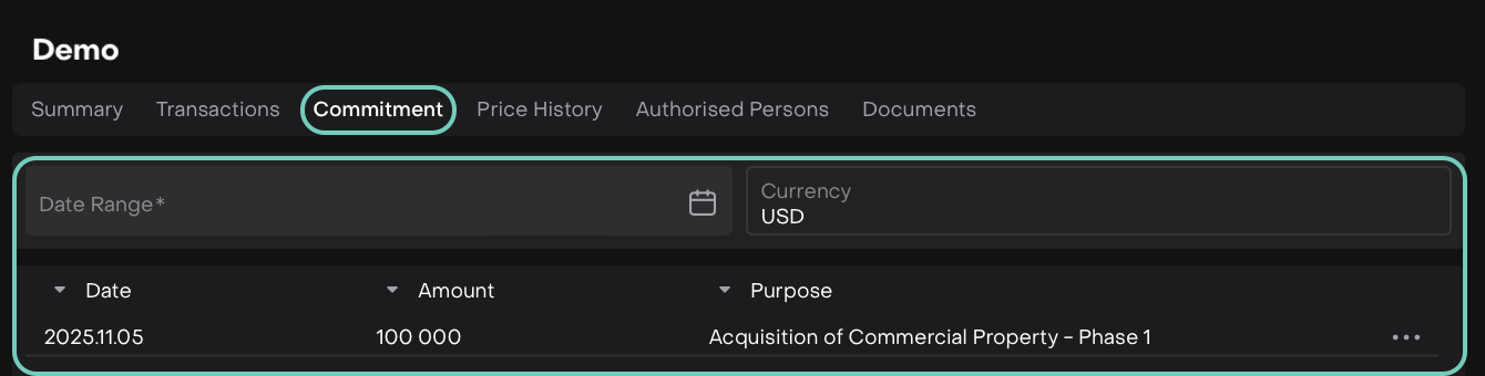 Commitment Tab in Private Assets