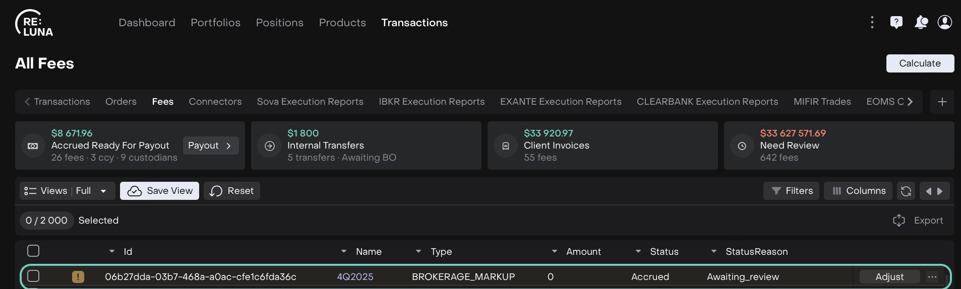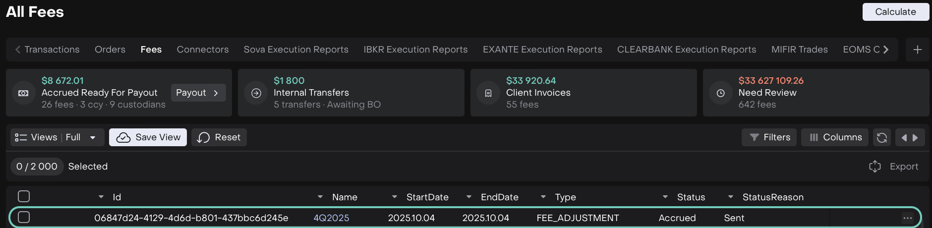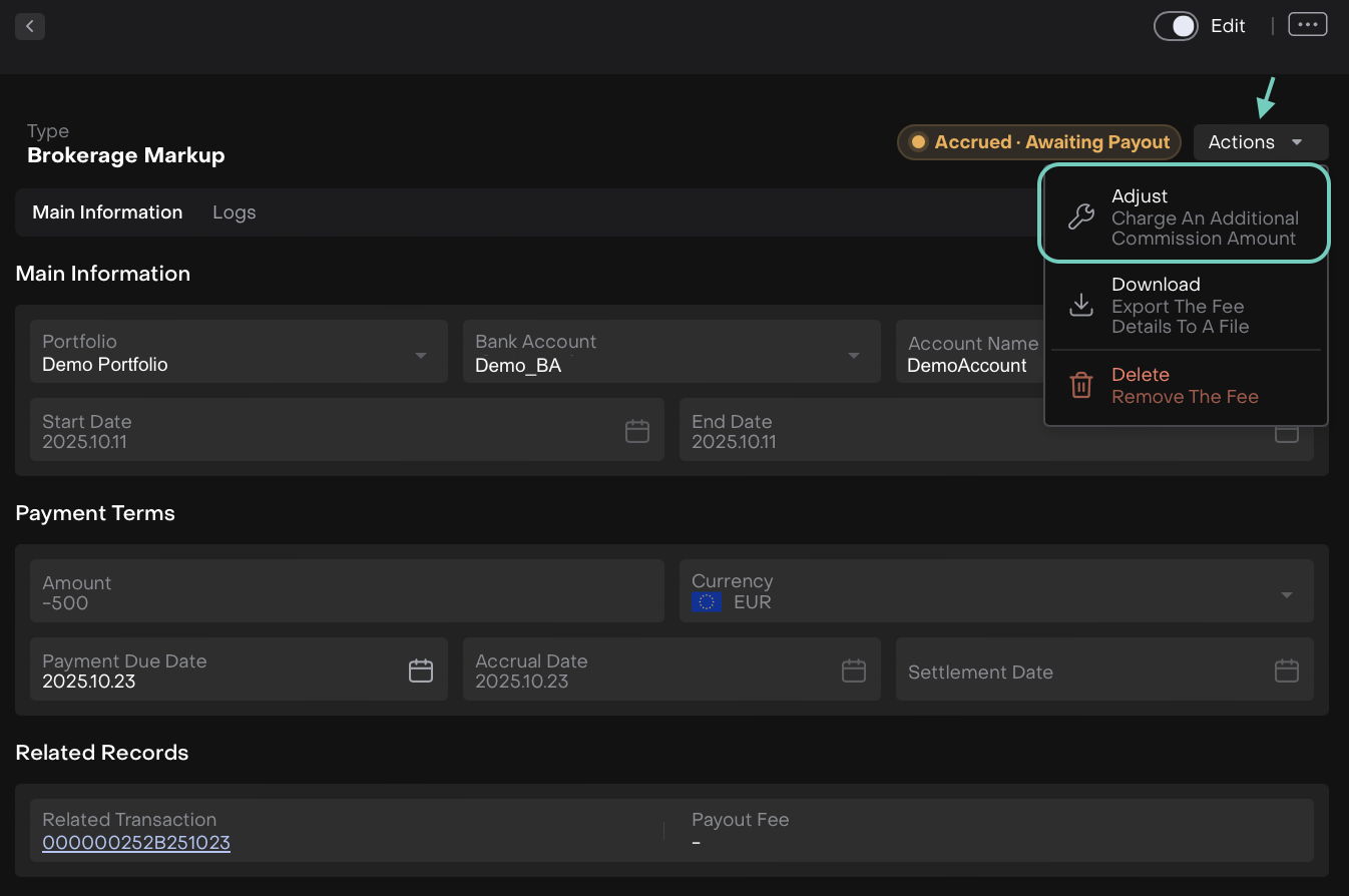 A new fee of type FEE ADJUSTMENT is created, with order auto-submitted and transaction auto-confirmed. The initial fee is released, and status changes to Accrued with Status Reason Awaiting Payout.