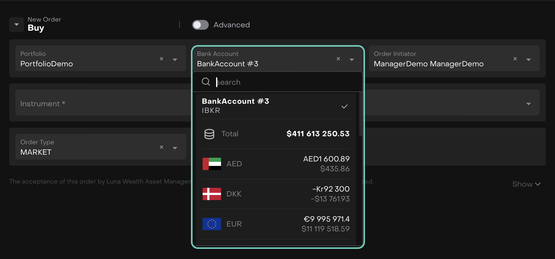The system now displays the total available cash in each selected bank account, broken down by currency. Additionally, displays the converted amount of each currency to the currency of the order.