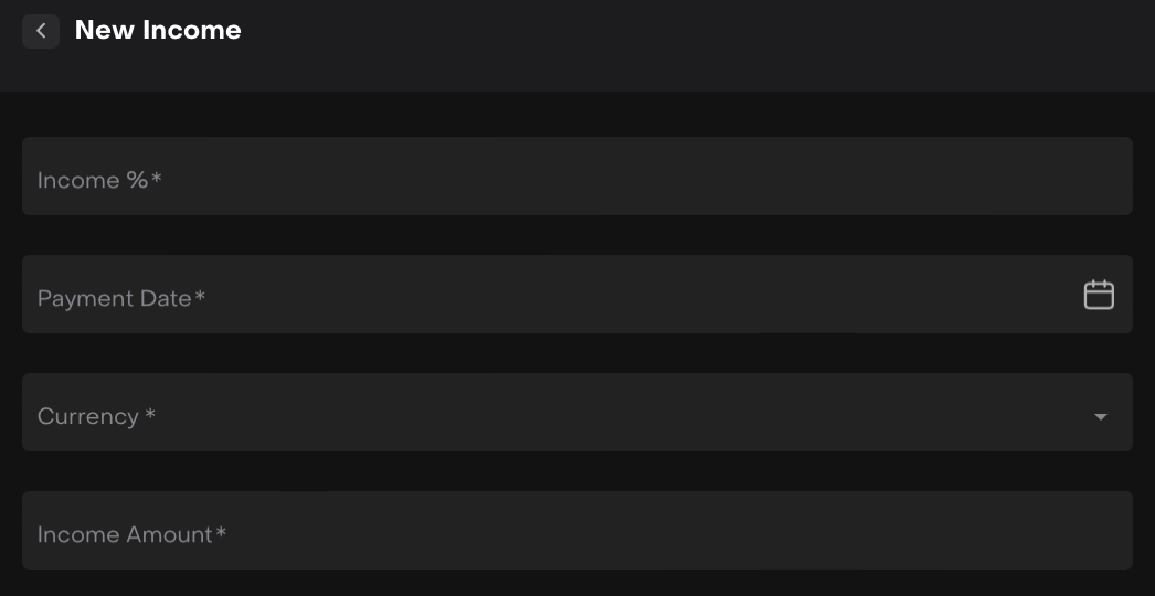 A New Income form opens > Fill in the required fields(*) and click Save.