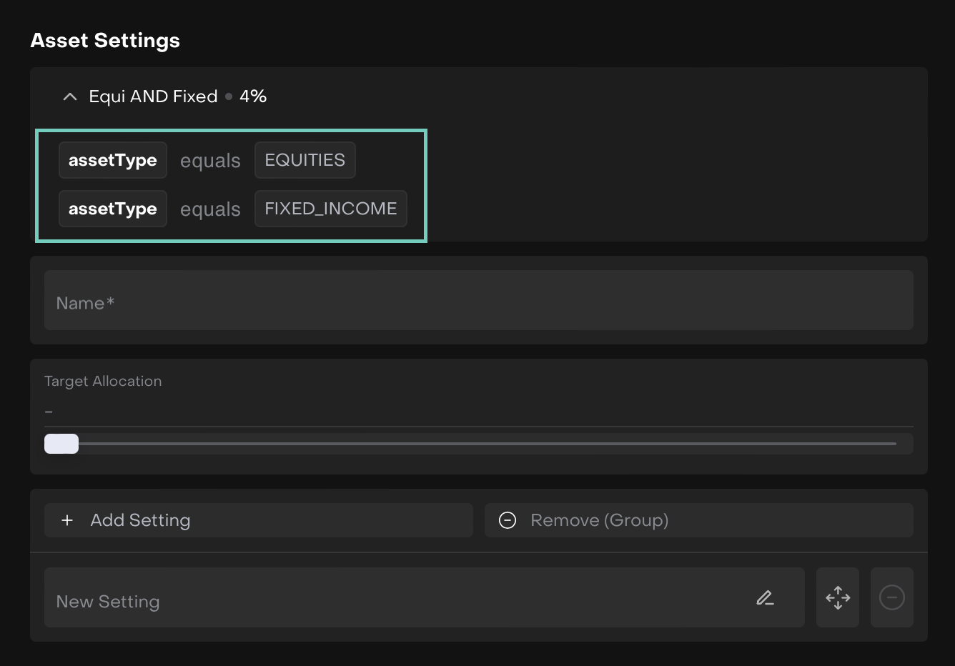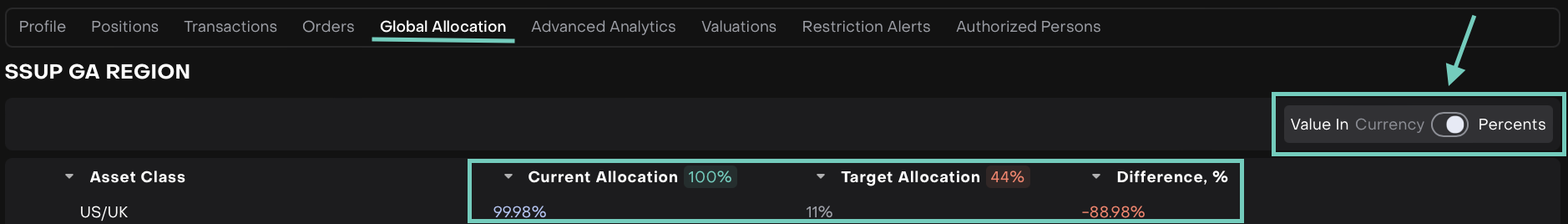 Now, a switcher is added to toggle between viewing values in Percentages or Currency for Current Allocation, Target Allocation, and Difference.