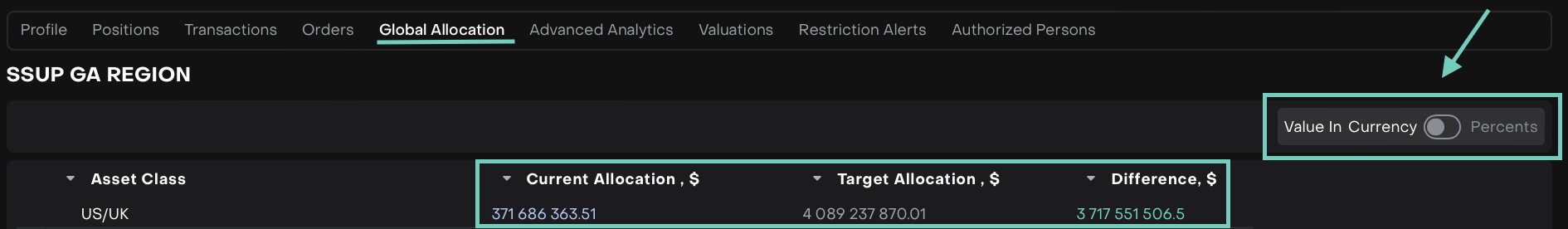 Added Switcher for % or Currency Display in Global Allocation (Portfolios Screen)