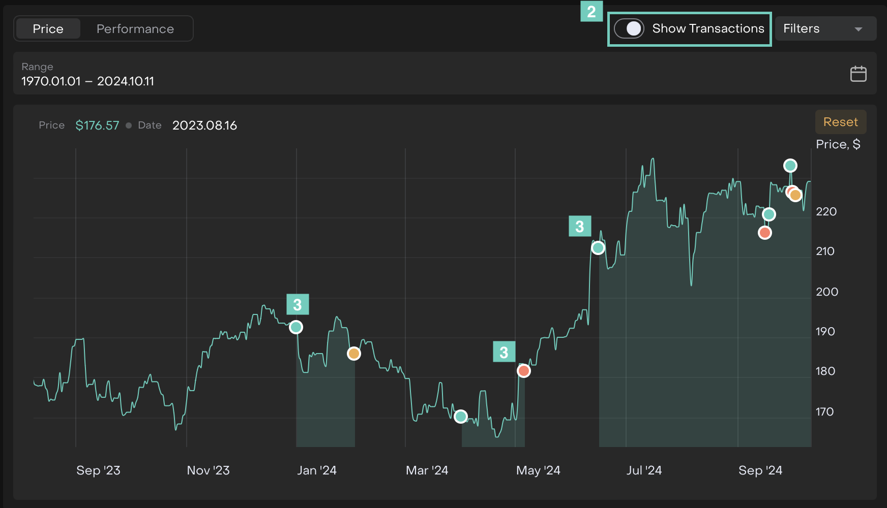The price/performance chart now displays various transaction types with clear indicators. A toggle button has been added, allowing to enable or disable the view of transactions on the chart.