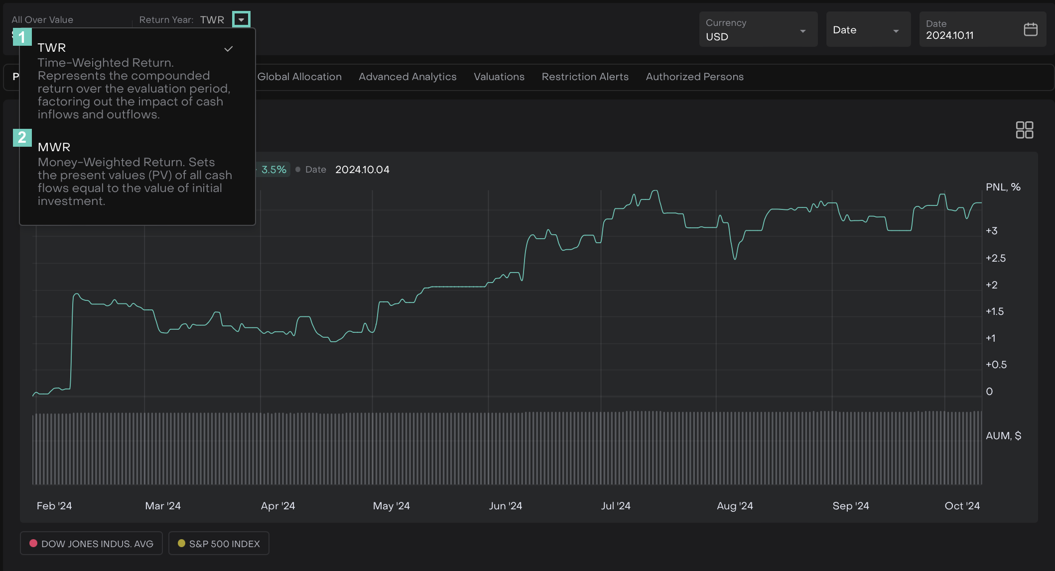 Added a dropdown button to switch between (1) TWR (Time-Weighted Return) and (2) MWR (Money-Weighted Return) PnL views on Dashboard and Portfolios (in Profile tab) screens of the system.