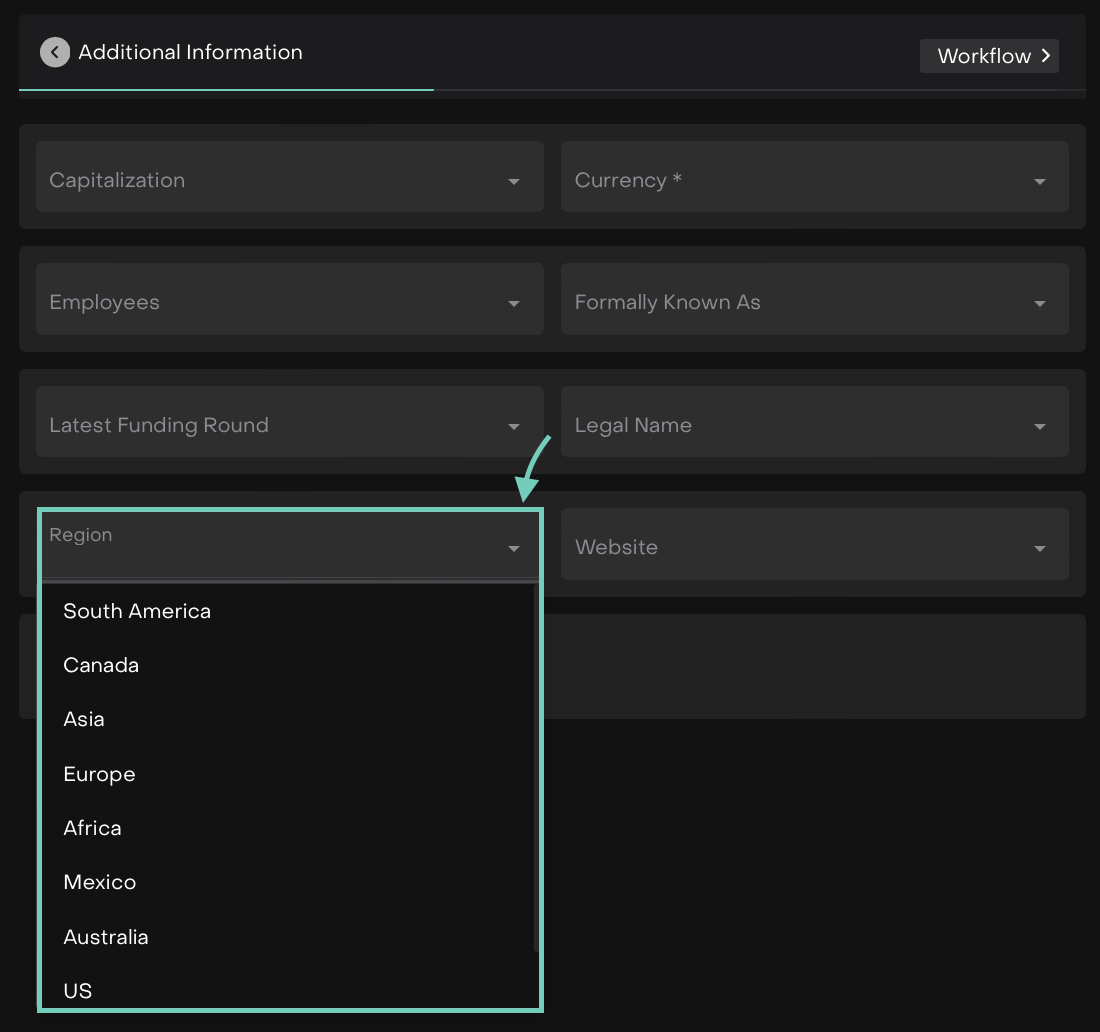 In Private Asset Workflow for 'Private Equity' Asset Type in Portfolios tab, the Region field has been upgraded from a free-text entry to a dropdown selector with a predefined list of regions.
