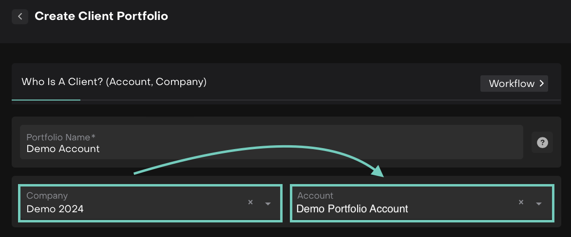 The process for creating a Virtual and Client portfolios are now consistent. First select a Company, followed by selecting an Account (filtered by the chosen Company).