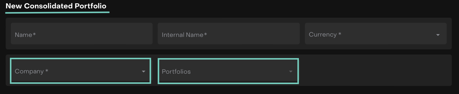 The New Consolidated Portfolio creation flow now only includes a Company and Portfolio selection fields, with portfolios filtered by the selected company. The Account selection field has been removed as it is no longer relevant to the process.