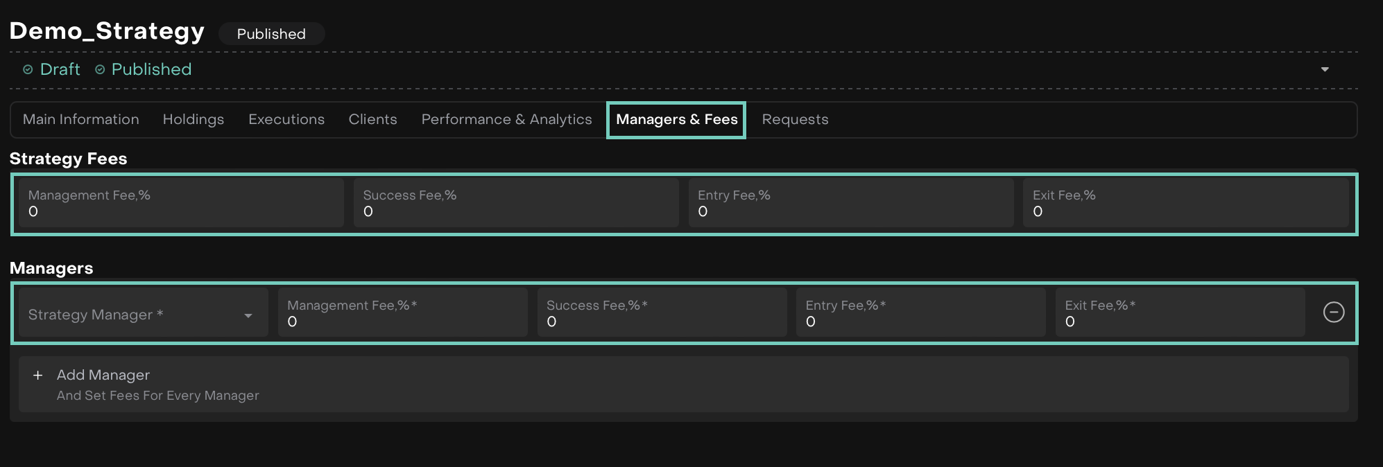 The "Managers & Fees" tab on the Products > Strategies has been updated. Now, select various fee types, including the "Management Fee," "Success Fee," "Entry Fee," and "Exit Fee" on a single screen.