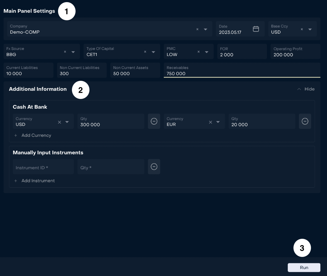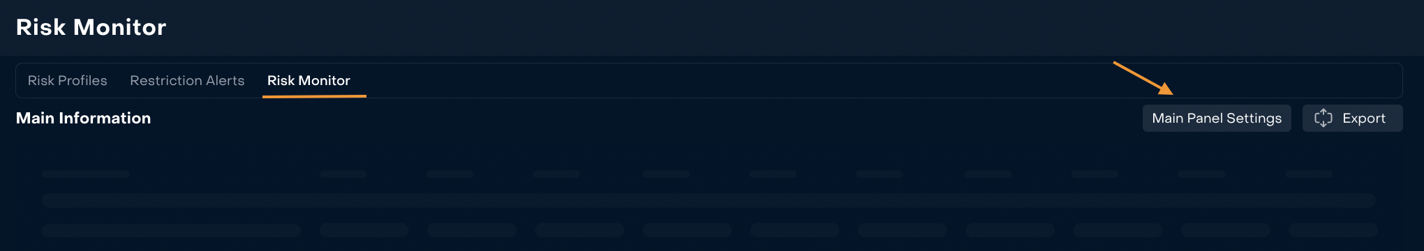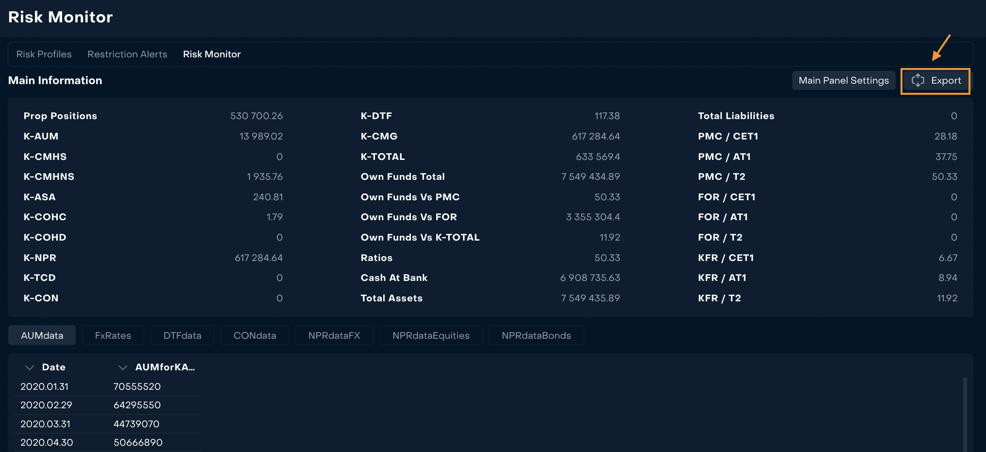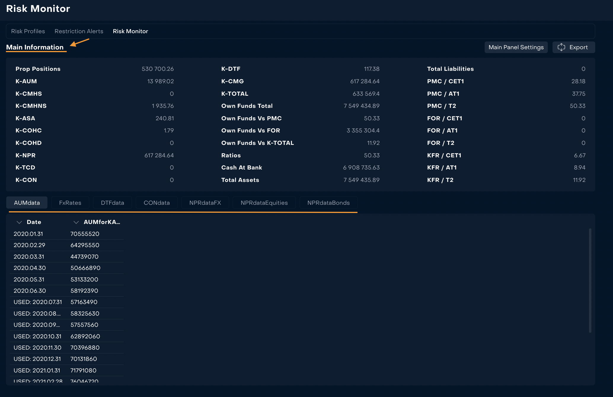 When the Risk Monitor report is opened for the first time, the system will show message “Data is empty”. The report information will appear after user fills in Main Panel Settings at least once.