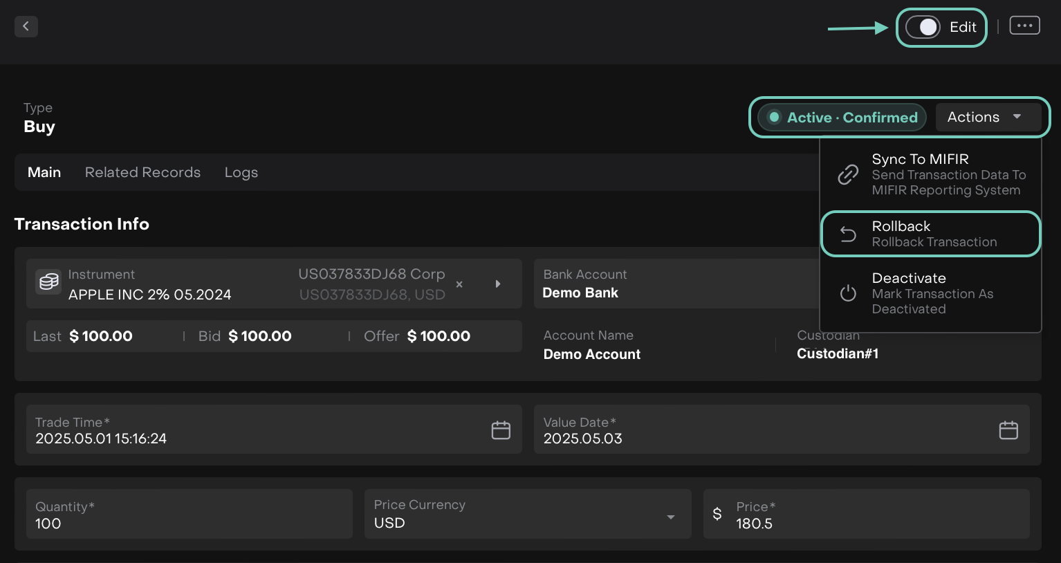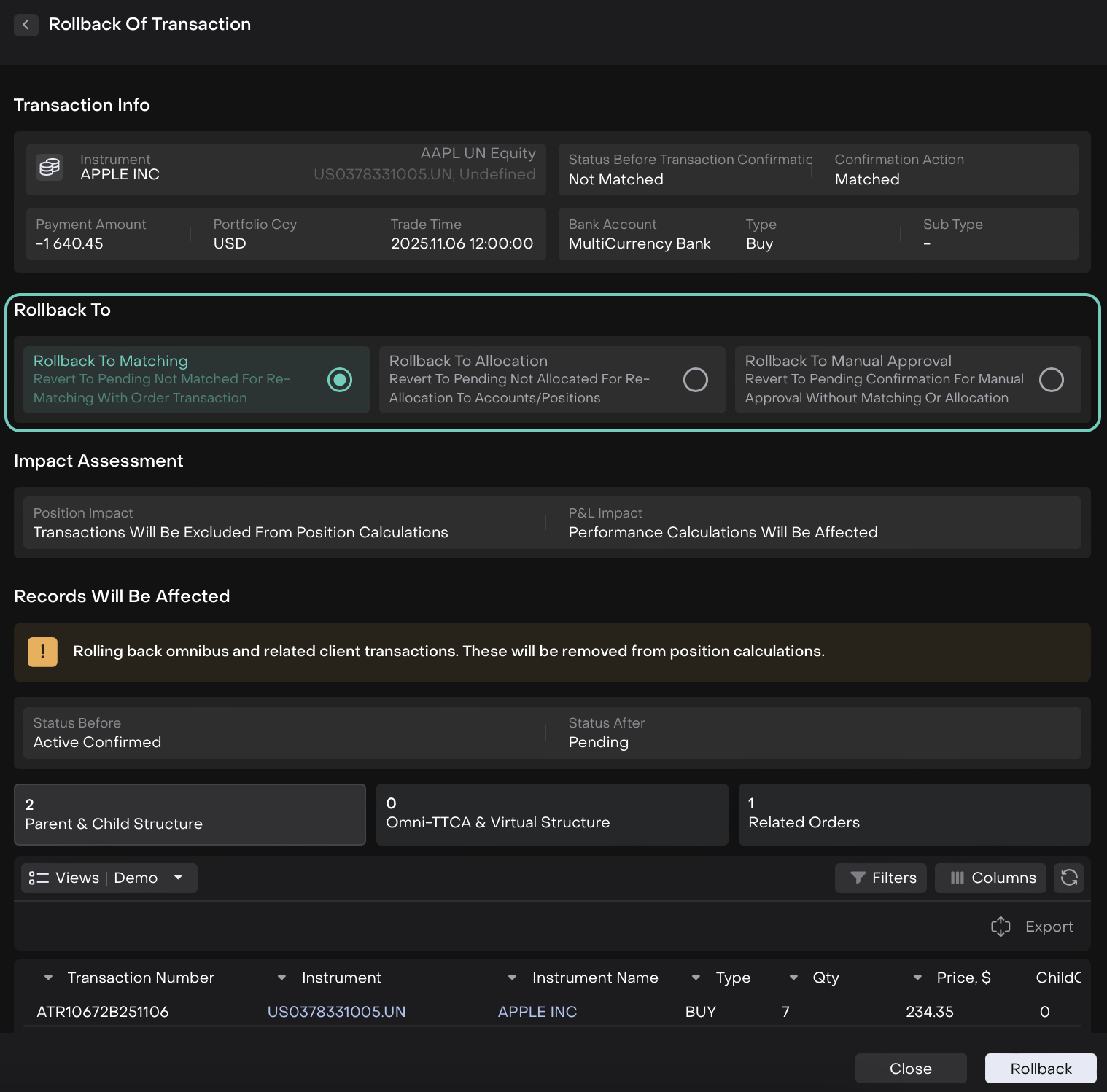 This enables you to fix incorrect data, correct matching issues or reprocess/reallocate the transaction without breaking the transaction lifecycle or creating portfolio inconsistencies.