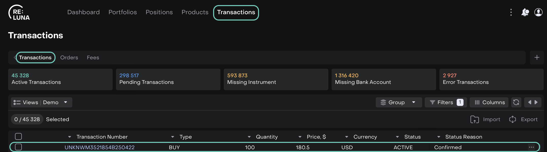 Locate the transaction that is in Active status with the status reason Confirmed.