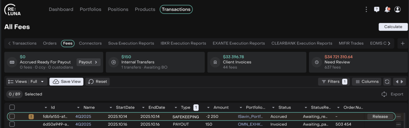 You can then generate a payout that automatically creates a Payout Fee, along with a related transaction and payout order, aggregating all accrued commissions by portfolio and currency.