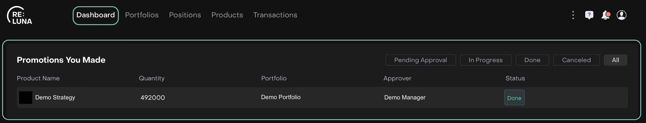 The Manager can review the list of all proposals and track their status both from the Strategy page or Dashboard.