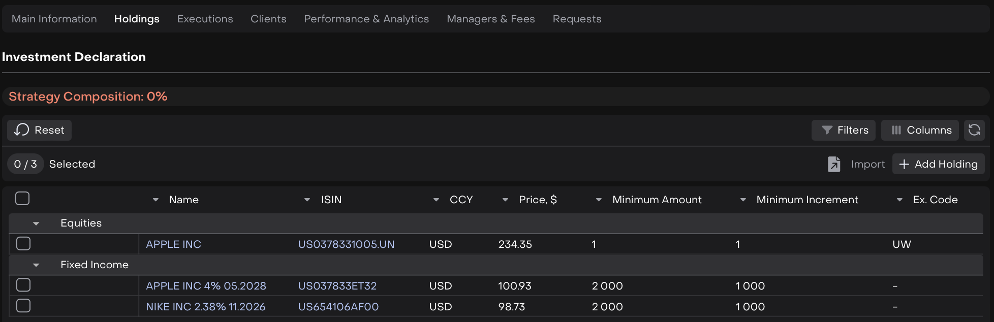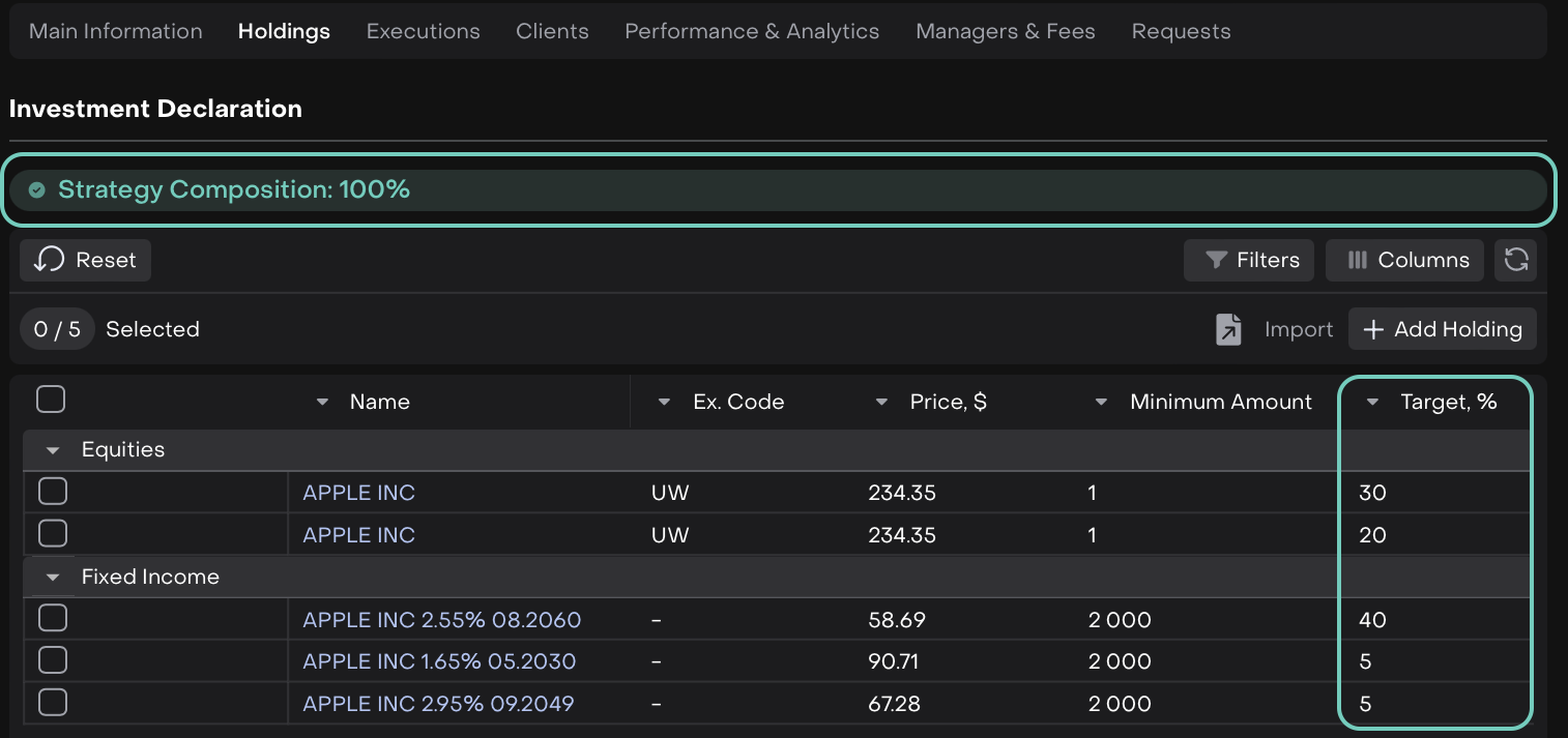 The Holdings tab lets you define the instruments included in your strategy. Here, you can view details such as instrument type, currency, price and specify the target allocation.