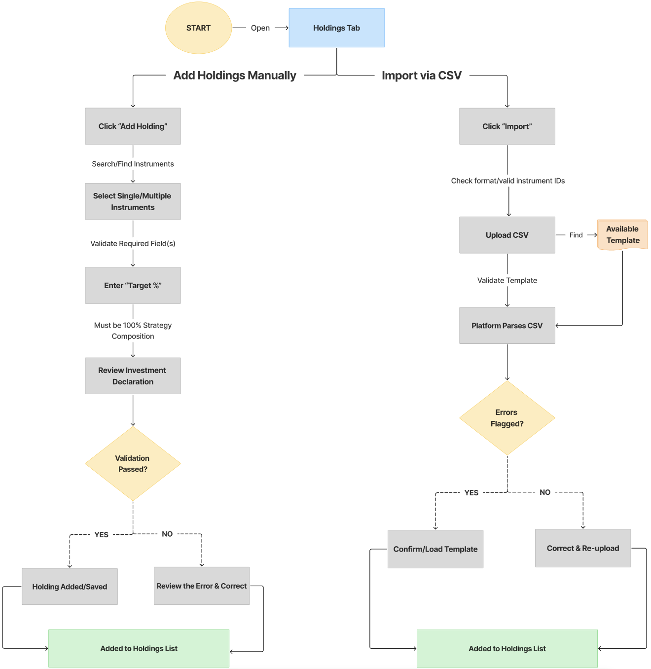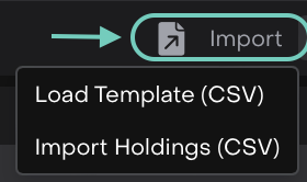CSV Import | A bulk upload option that allows you to import holdings from a CSV template instead of adding them manually. |