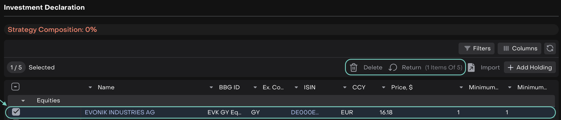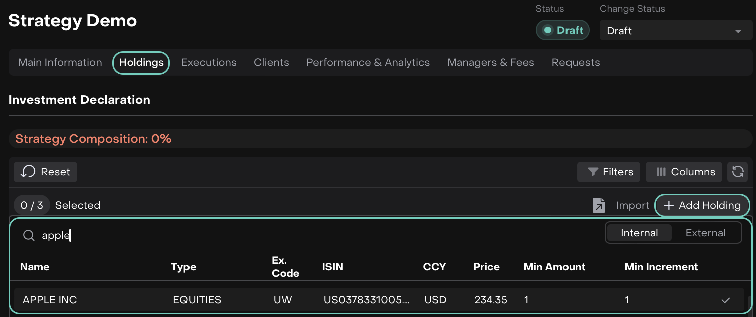 Add Holding | Option to add new instruments (Internal or External) to your strategy holdings. |