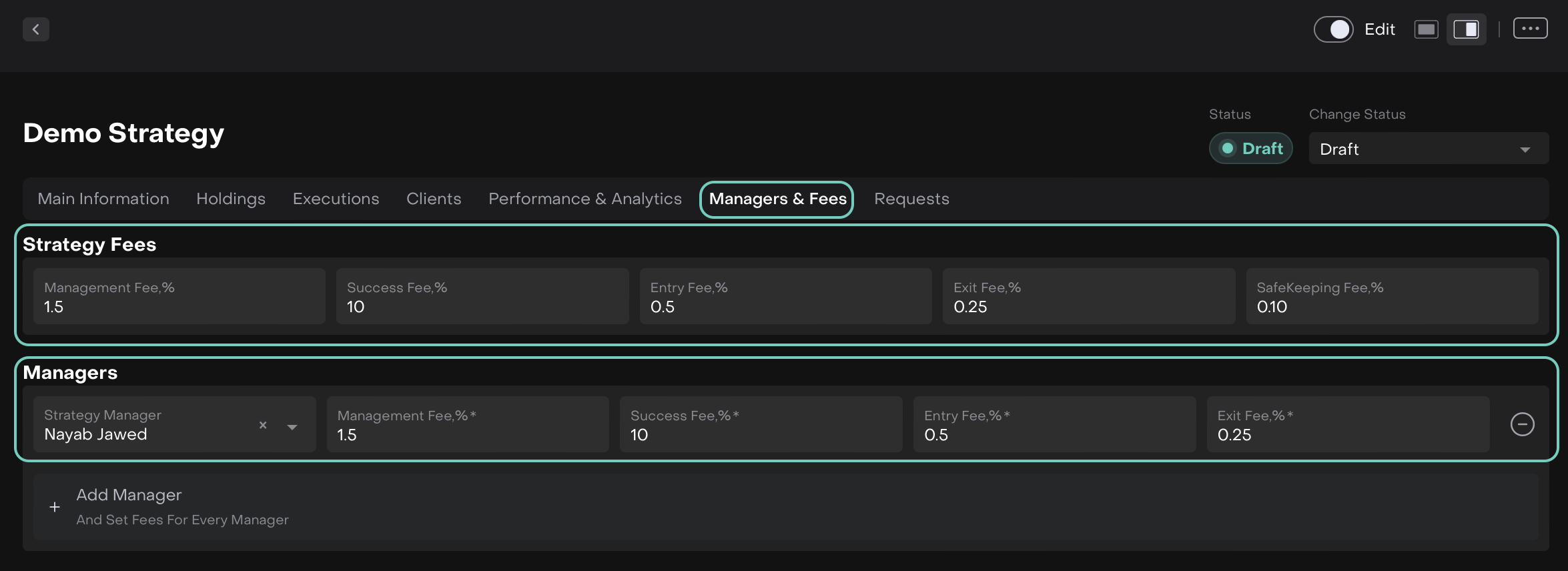 The Managers & Fees tab lets you assign strategy managers, define fee structures and control user access to the strategy.