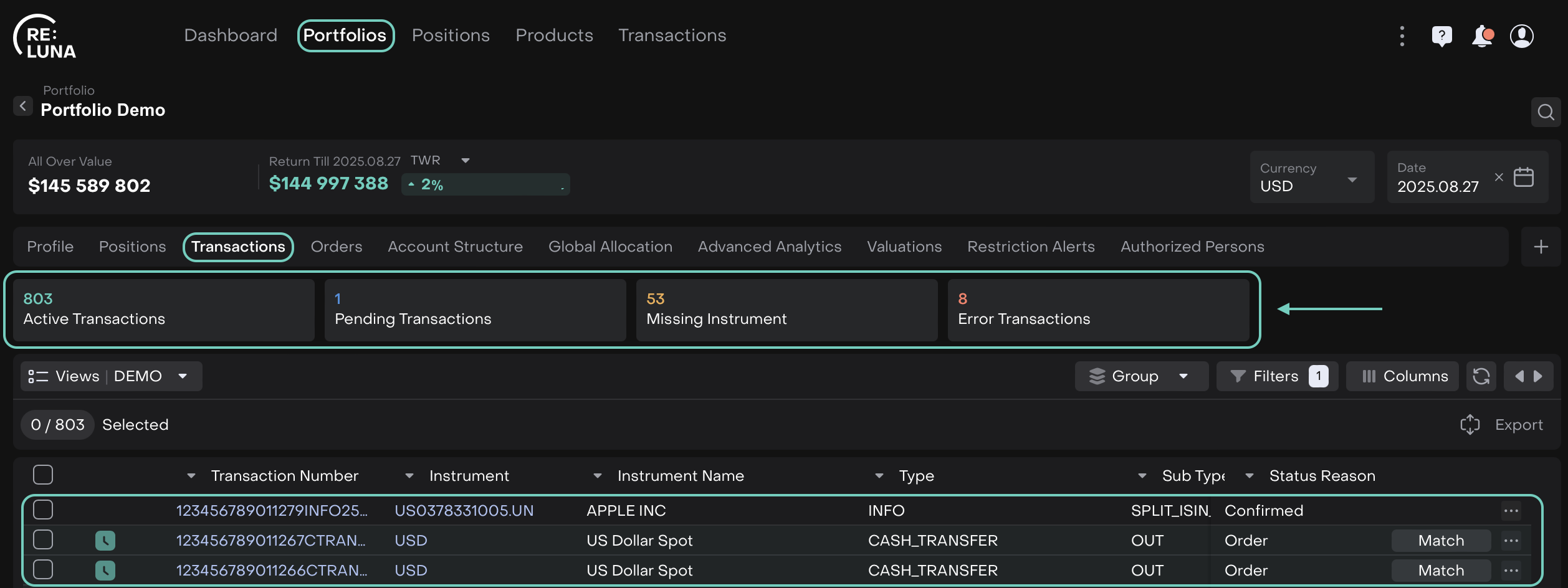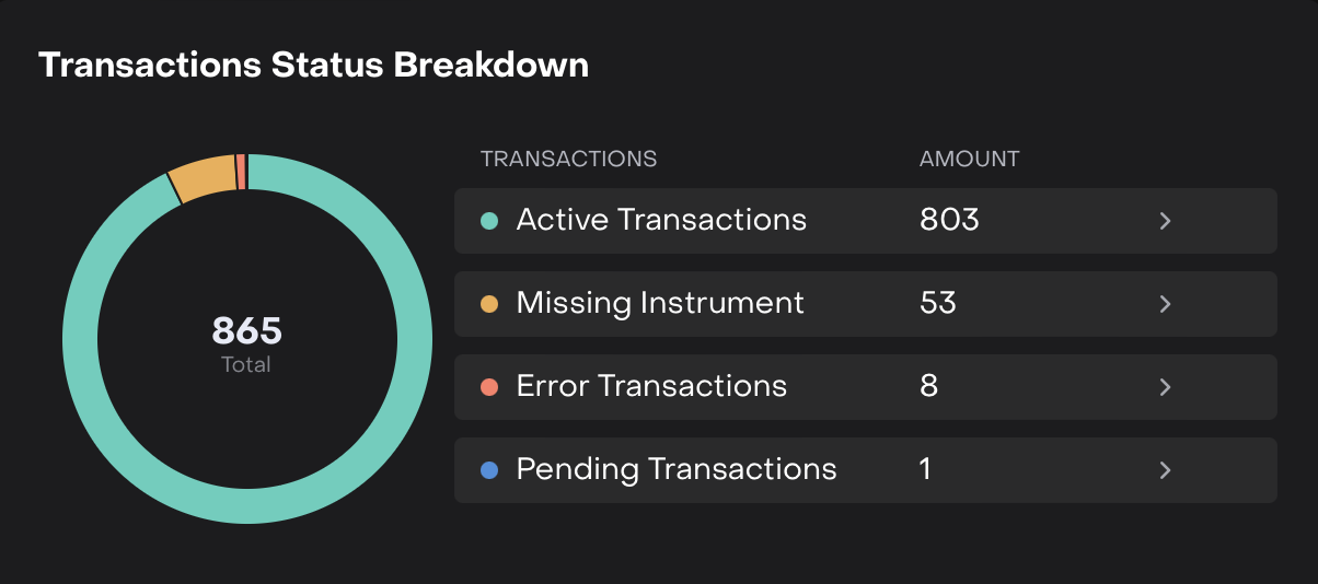 The Transactions Status Breakdown Widget gives you a clear overview of all transaction statuses in your portfolio. It helps you quickly see which transactions are active, missing, pending or have errors, and provides direct access to the detailed transaction lists.