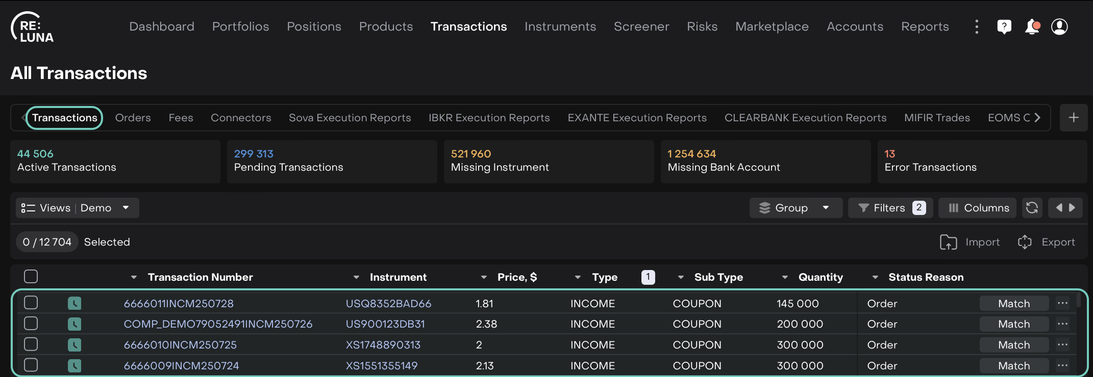 To match incomes received from the Custody with Order transactions platform checks: