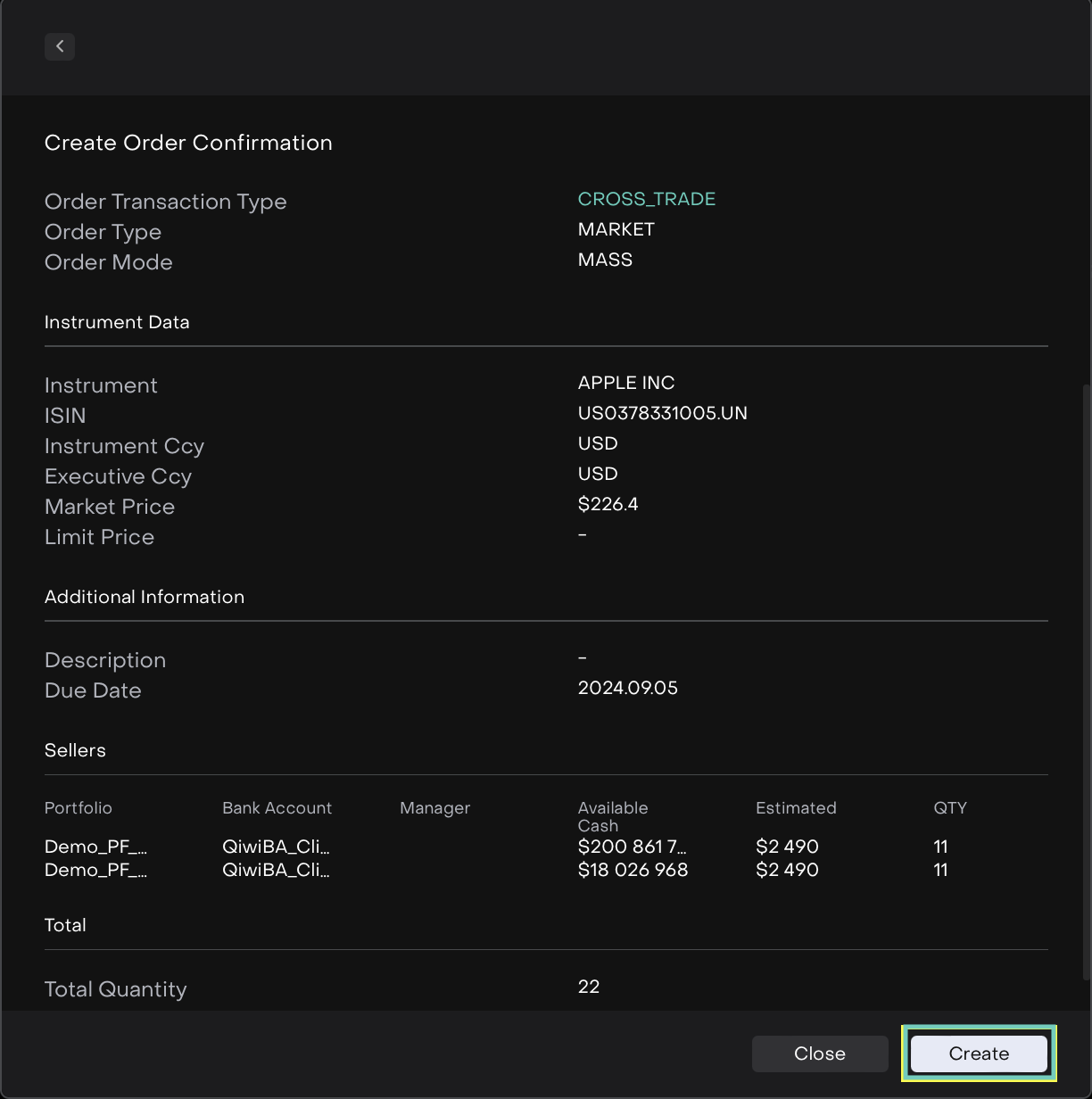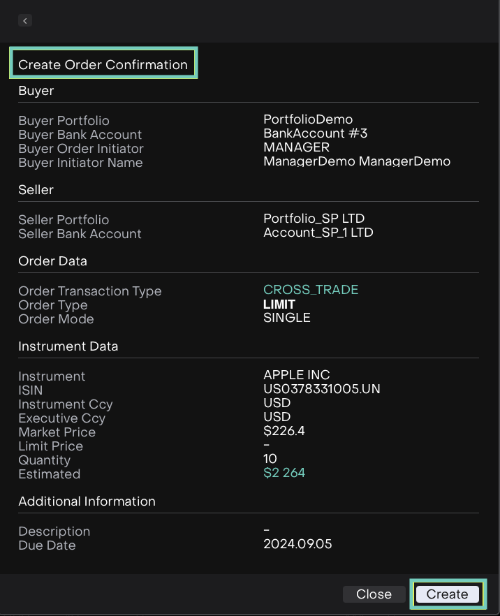 The Order Confirmation summary shows up either for Buy/Sell, click on Create to confirm or Close to go back.