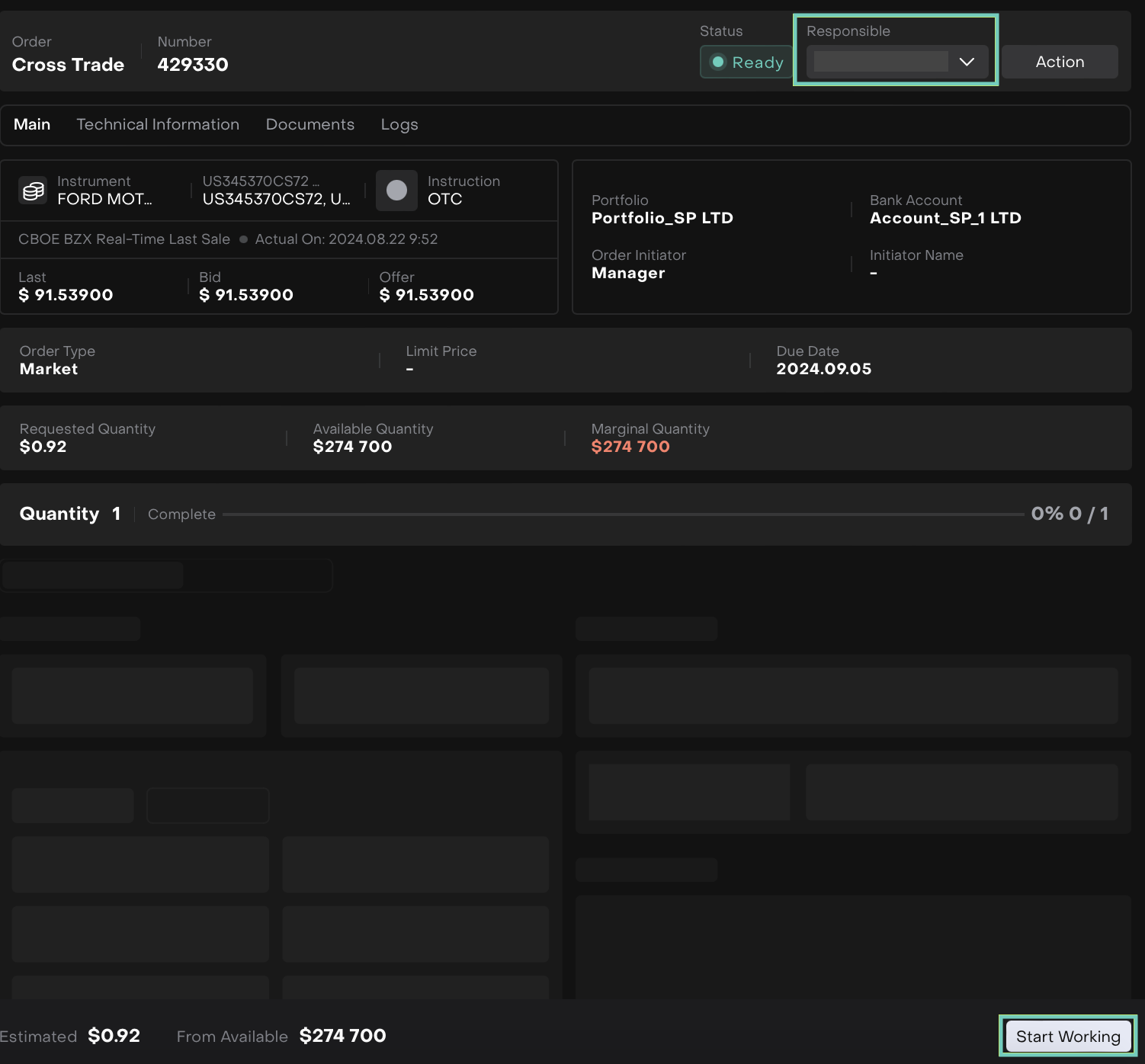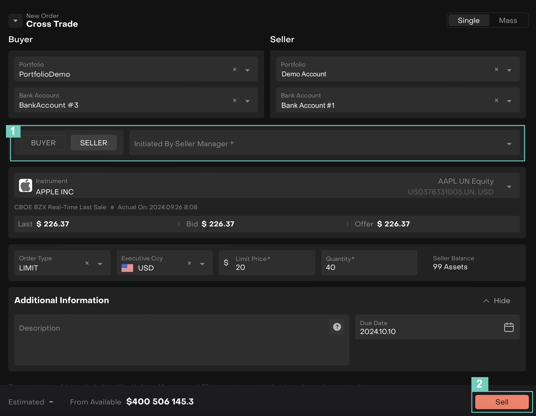 On Cross Order page, click on the Edit button to add Portfolio and Bank Account details for Buyer and Seller fields.