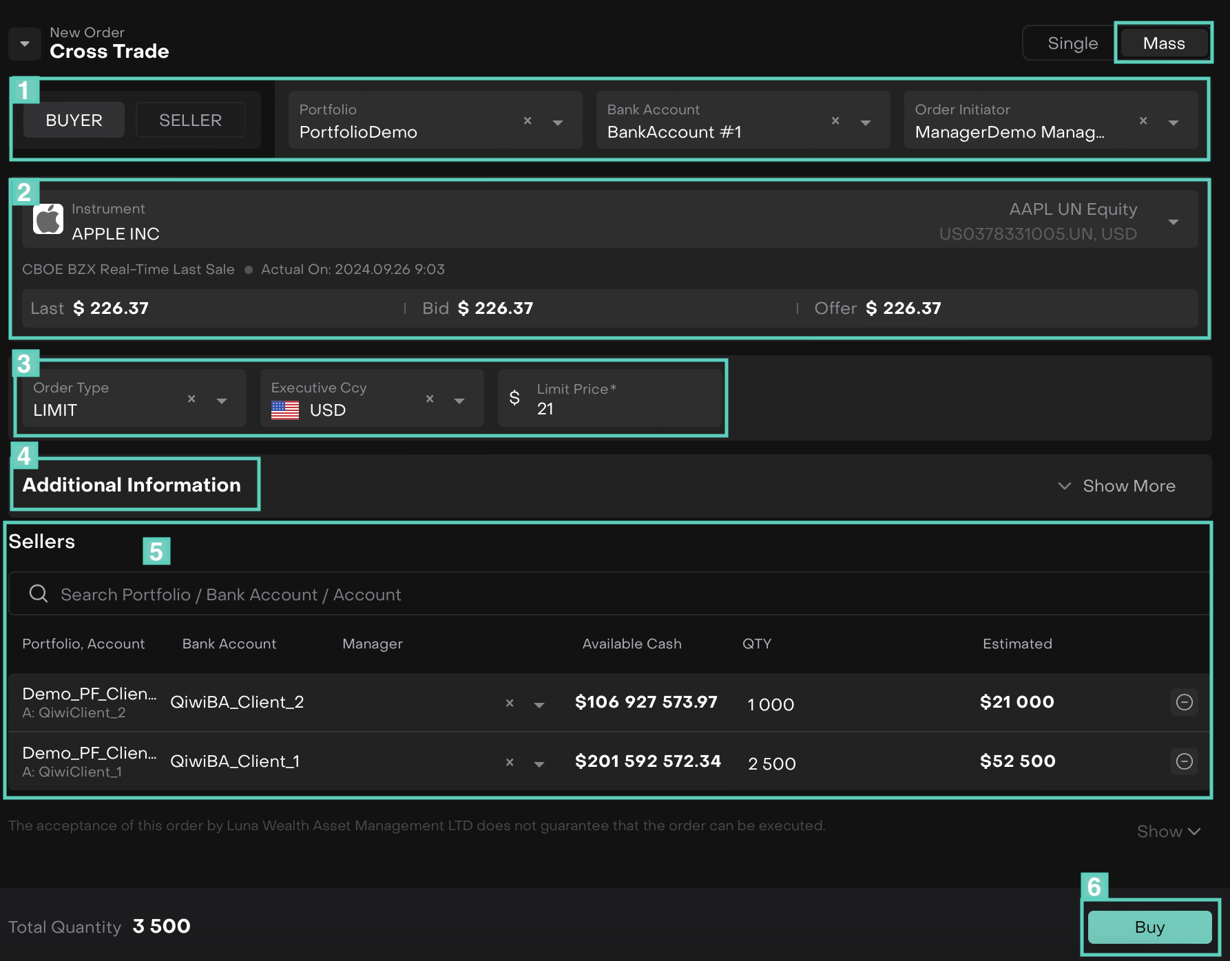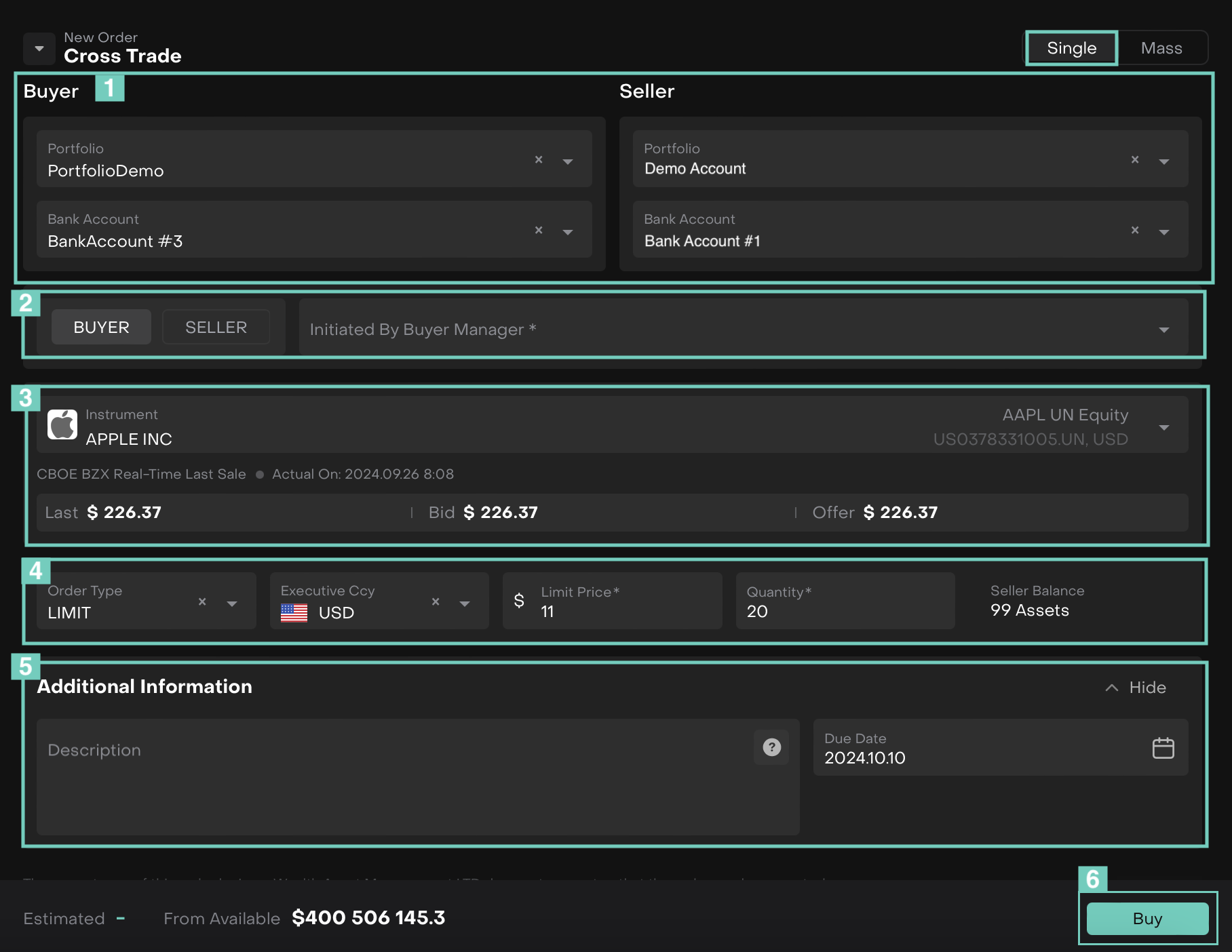 Select the Buyer category from the switch. Fill in the required details as Portfolio, Bank Account and Order Initiator.