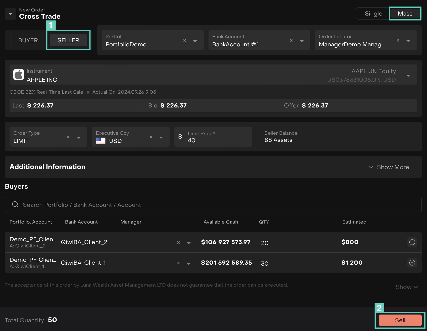 Fill in the required fields as shown above for Mass Order form creation.Click on Sell button.