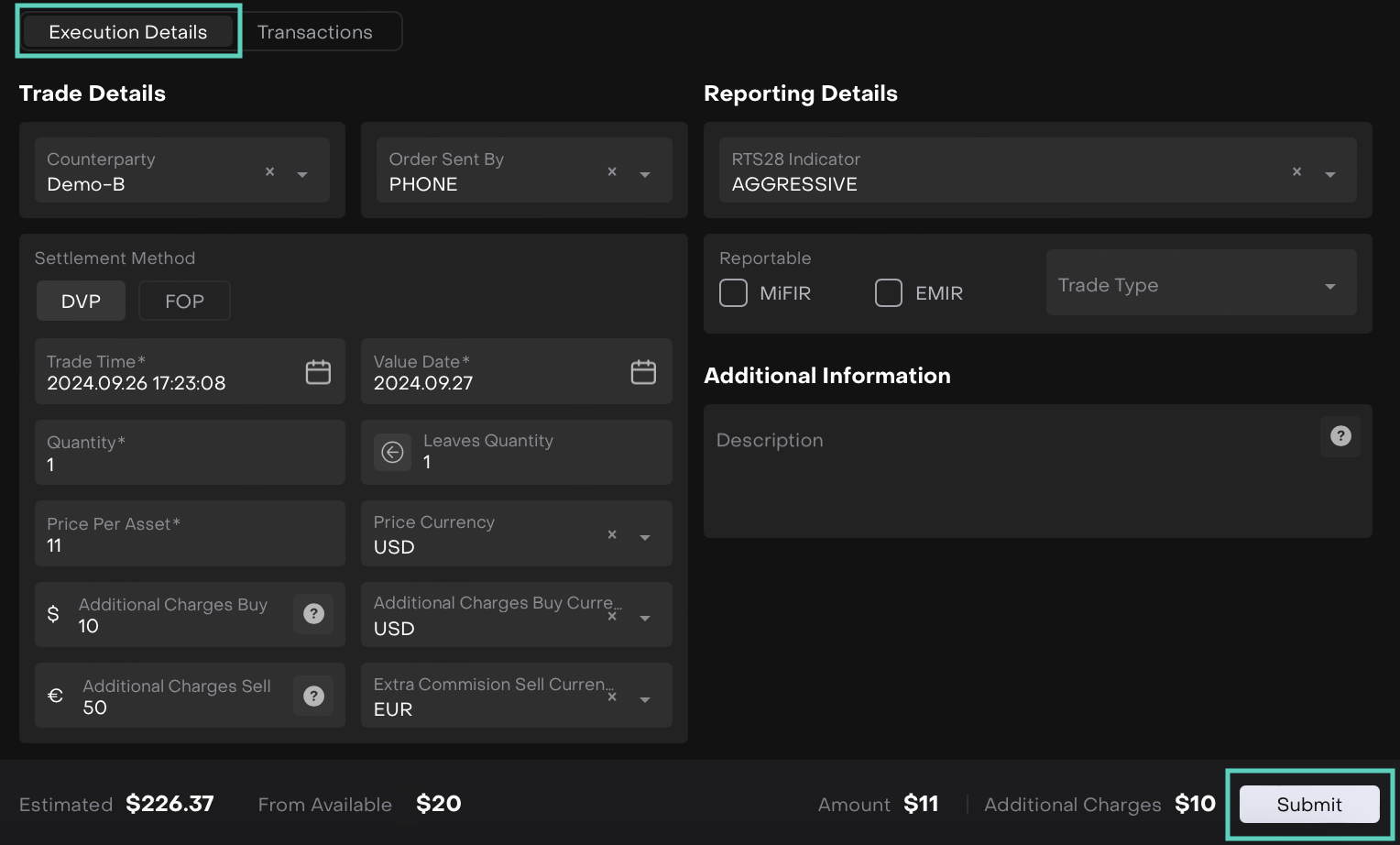The following required Execution Details tab needs to be filled with mandatory fields(*) > Click Submit.