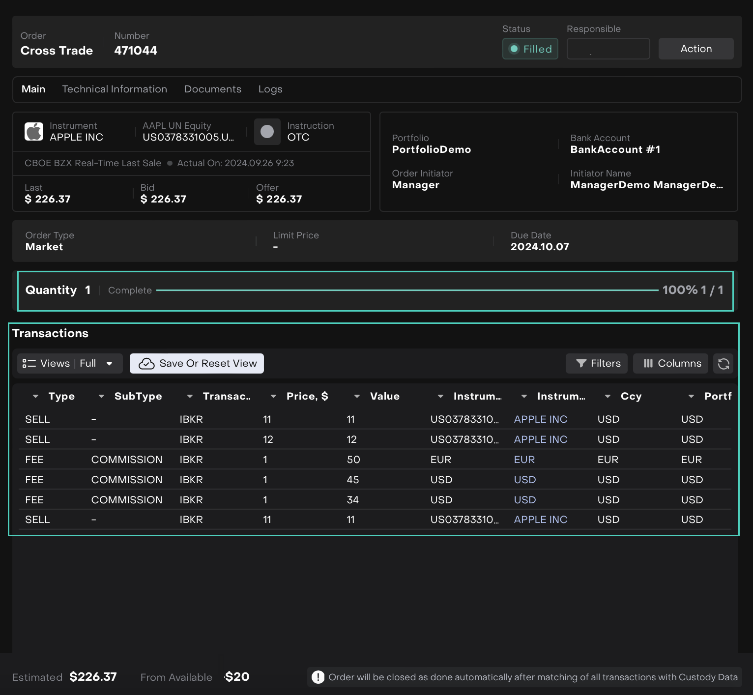 For Seller the system will generate a sell transaction and for Buyer side the system will generate a buy transaction. If commission was indicated for buy or sell side on the order execution form, it will be reflected accordingly as Fee (Commission) transaction(s).