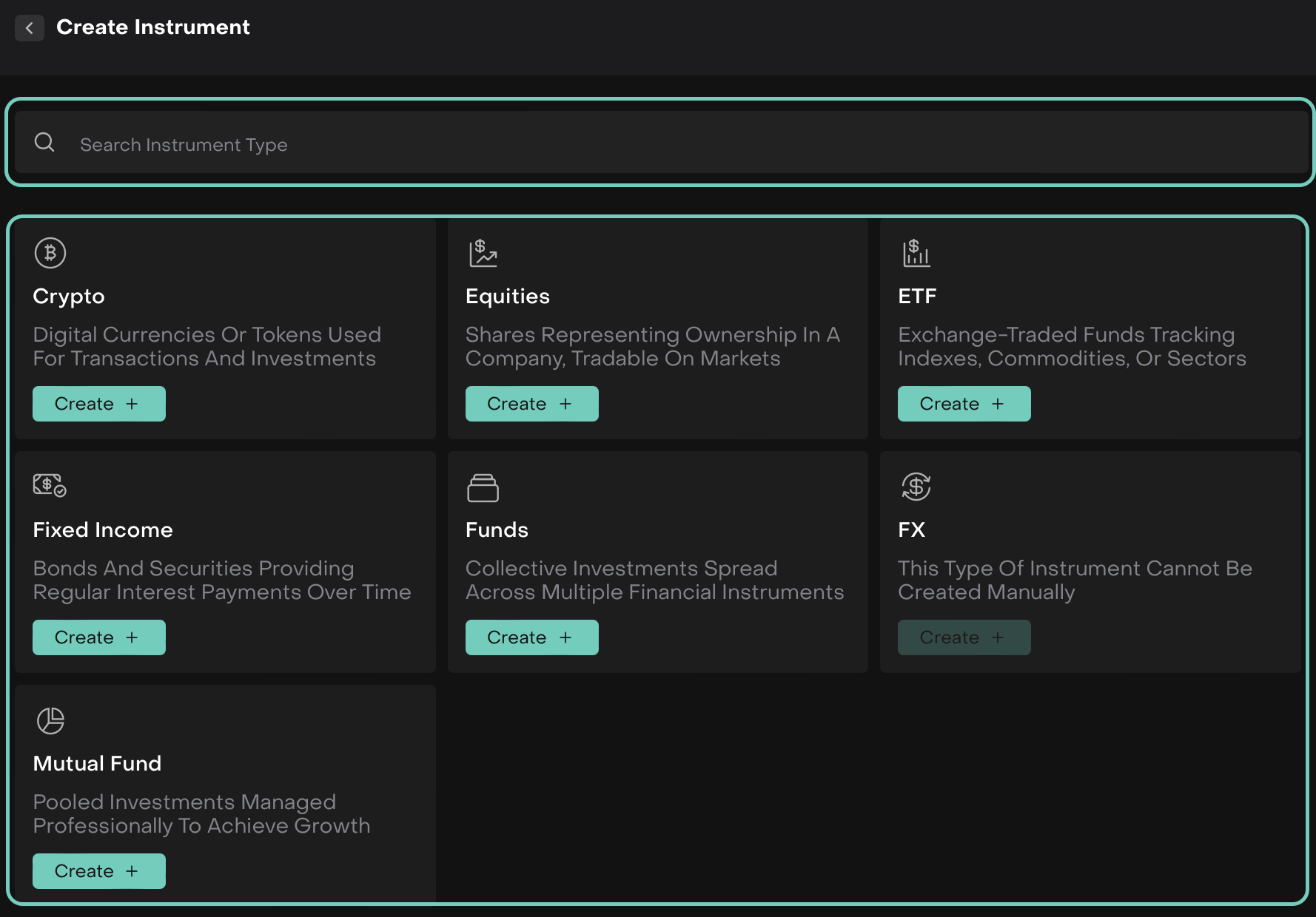 Choose the Instrument Type (e.g., Fixed Income, Certificate, Equities, Futures, Options and more).
