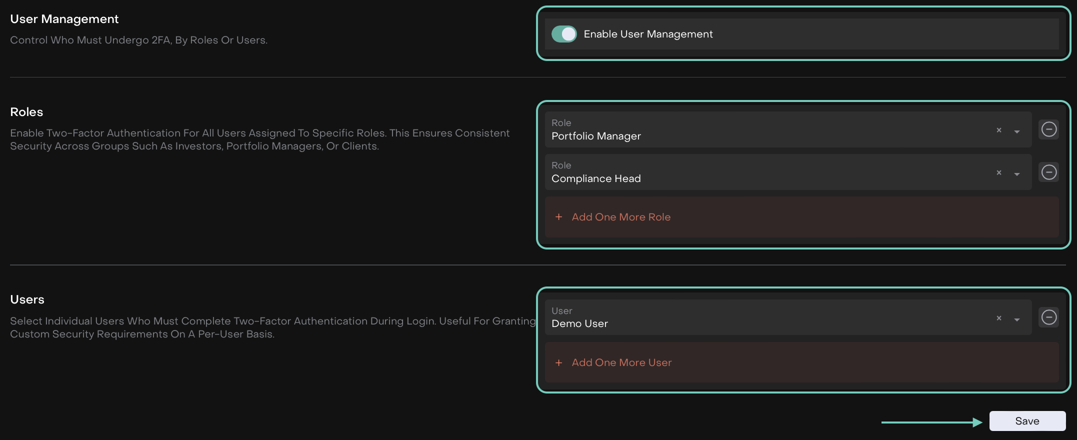 Roles - Select roles that should require 2FA. Multiple roles can be added.