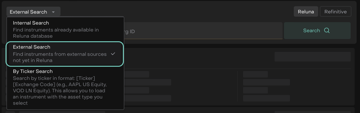 Includes Public/Private Databases of Reluna for the specific production. | Searching of Instrument(s) in Market Data Source by any key symbol. | Search External in Market Sources by Ticker ID or Asset Type and its Sub type. |